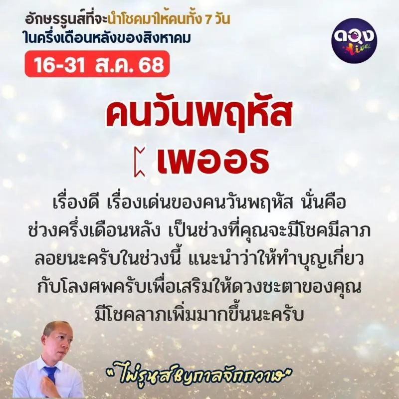 ᛈ – เพออธ เรื่องดี เรื่องเด่นของคนวันพฤหัส นั่นคือ ช่วงครึ่งเดือนหลังจะเป็นช่วงที่คุณจะมีโชค มีลาภลอยนะครับ แนะนำว่าให้ทำบุญเกี่ยวกับโลงศพครับ เพื่อเสริมให้ดวงชะตาของคุณมีโชคลาภเพิ่มมากขึ้นนะครับ