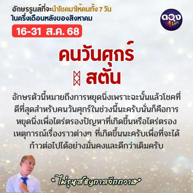 ᛥ – สตัน อักษรตัวนี้หมายถึง “การหยุดนิ่ง” เพราะฉะนั้นแล้ว โชคที่ดีที่สุดสำหรับคนวันศุกร์ในช่วงนี้นะครับ นั่นก็คือการหยุดนิ่งเพื่อไตร่ตรองปัญหาที่เกิดขึ้น หรือไตร่ตรองเหตุการณ์เรื่องราวต่างๆ ที่เกิดขึ้น เพื่อที่จะได้ก้าวต่อไปได้อย่างมั่นคงและดีกว่าเดิมครับ