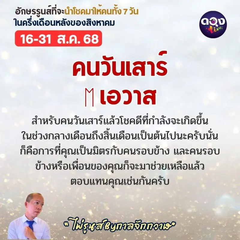 ᛖ – เอวาส สำหรับคนวันเสาร์แล้ว โชคดีที่กำลังจะเกิดขึ้นในช่วงกลางเดือนถึงสิ้นเดือน นั่นก็คือ การที่คุณเป็นมิตรกับคนรอบข้าง และคนรอบข้างหรือเพื่อนของคุณก็จะมาช่วยเหลือและตอบแทนคุณเช่นกันครับ