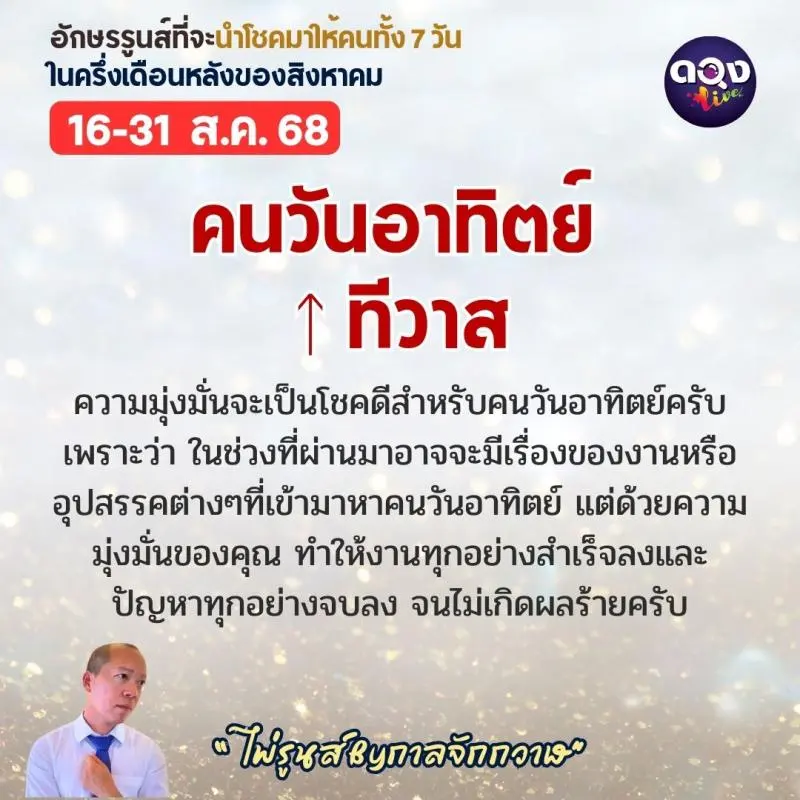 ᛏ – ทีวาส ความมุ่งมั่นจะเป็นโชคดีสำหรับคนวันอาทิตย์ครับ เพราะว่าในช่วงที่ผ่านมาอาจจะมีเรื่องของงาน หรืออุปสรรคต่างๆ ที่เข้ามาหา แต่ด้วยความมุ่งมั่นของคุณ ทำให้งานทุกอย่างสำเร็จลง และปัญหาทุกอย่างจบลงจนไม่เกิดผลร้ายครับ