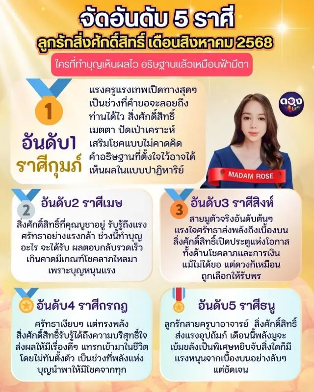จัดอันดับ 5 ราศีลูกรักสิ่งศักดิ์สิทธิ์ เดือนสิงหาคม 2568 by MADAM ROSE