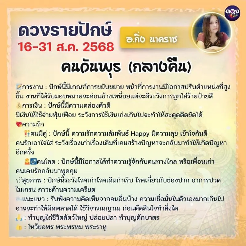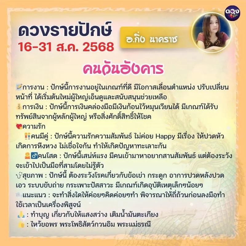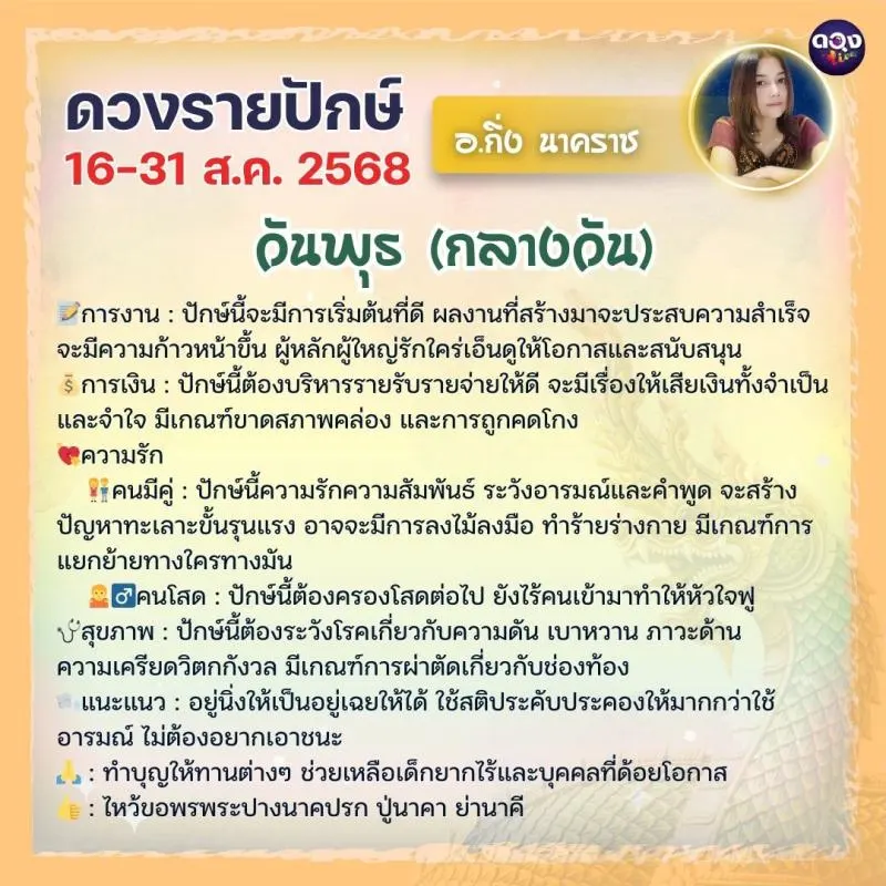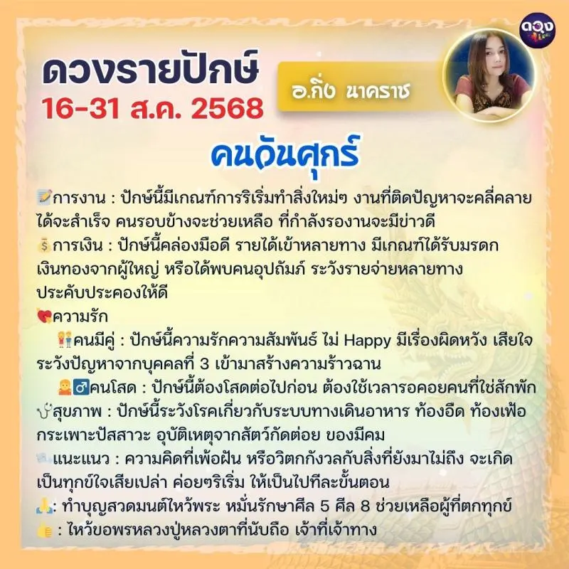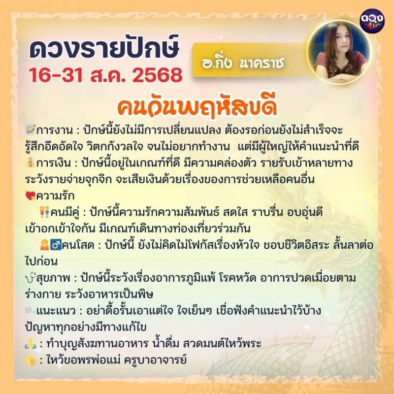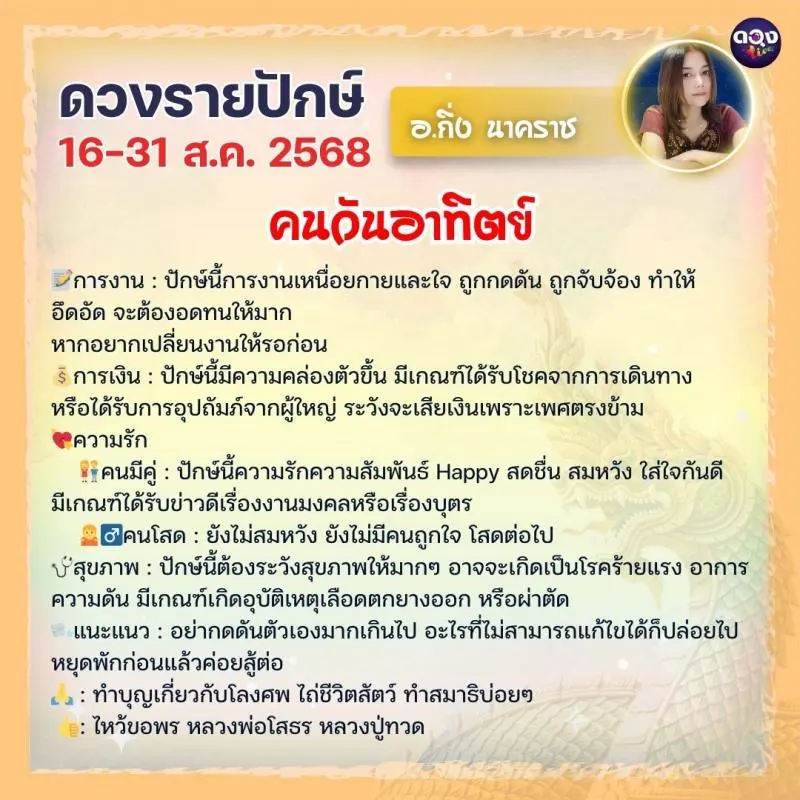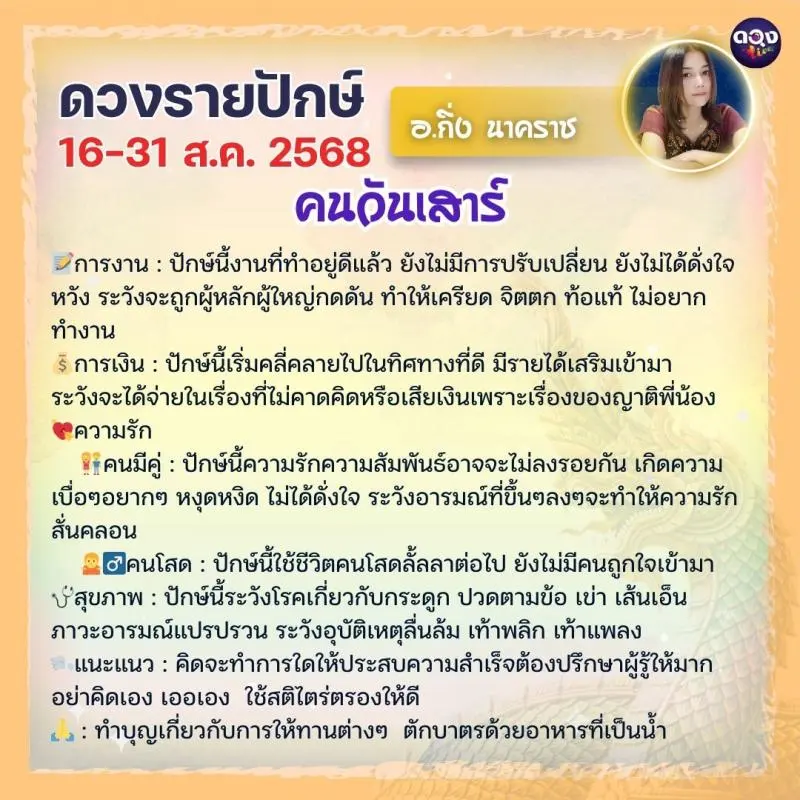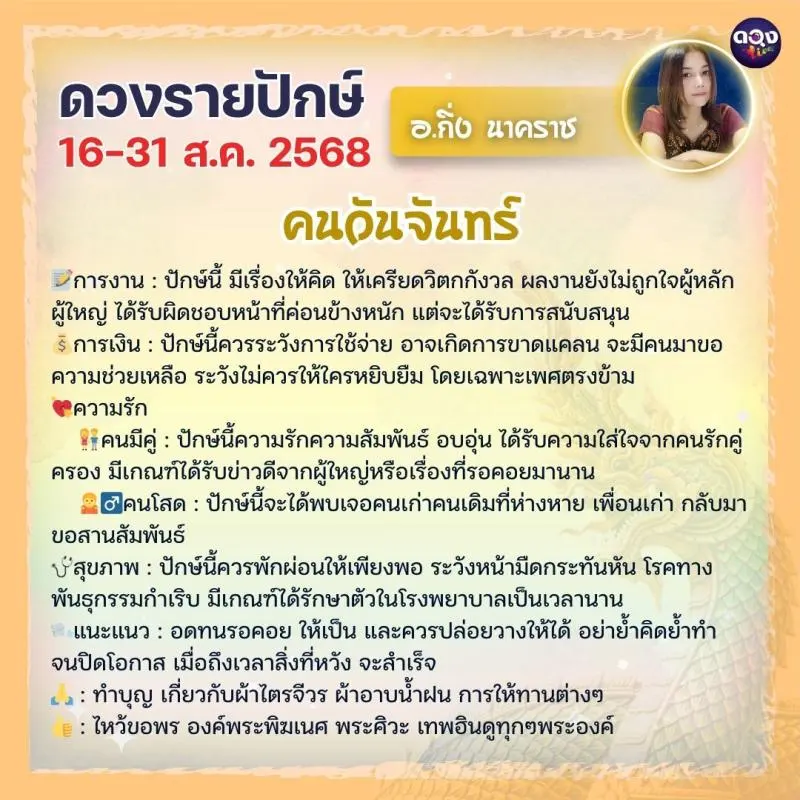 ดวงรายปักษ์วันที่ 16~31 ส.ค. 2568 โดย อ.กิ่ง นาคราช
