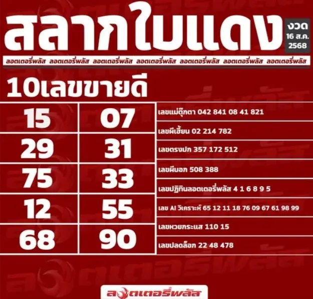 10 เลขขายดี "สลากใบแดง" งวดวันที่ 16 สิงหาคม 68..พรุ่งนี้รวย คอหวยส่องด่วน!!