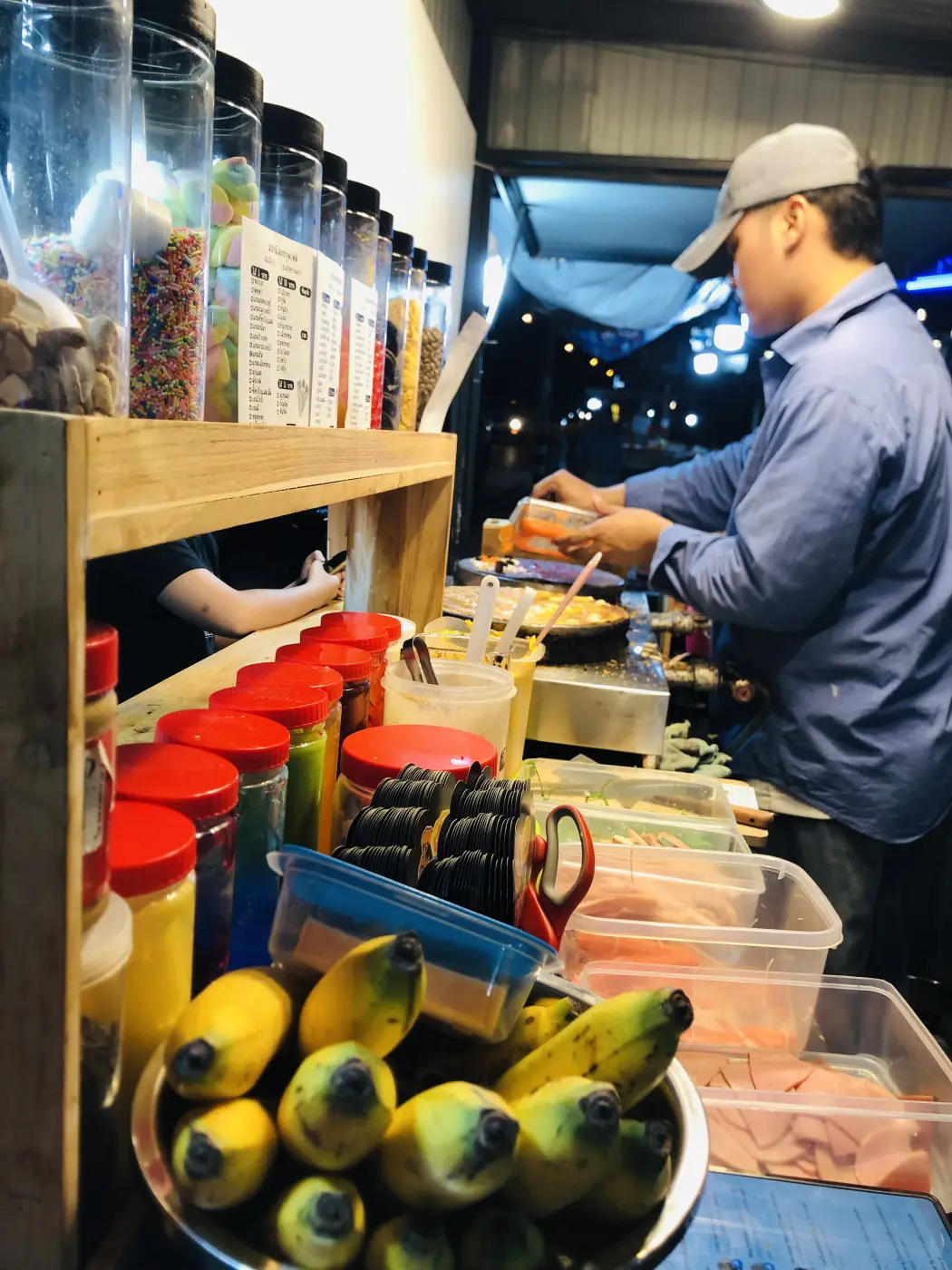 ร้านนี้เพิ่งเปิดในแวงใหญ่ประมาณสองอาทิตย์ได้เริ่มที่จะมีเด็กๆ ที่ชอบมาสั่งแล้วจำนวนมาก ไส้ที่แตกต่างกันไปแต่ขอบอกว่าใส่ไส้แน่น และมีแป้งให้เลือกทั้งหมดสองอย่าง ชาโคร และวนิลา