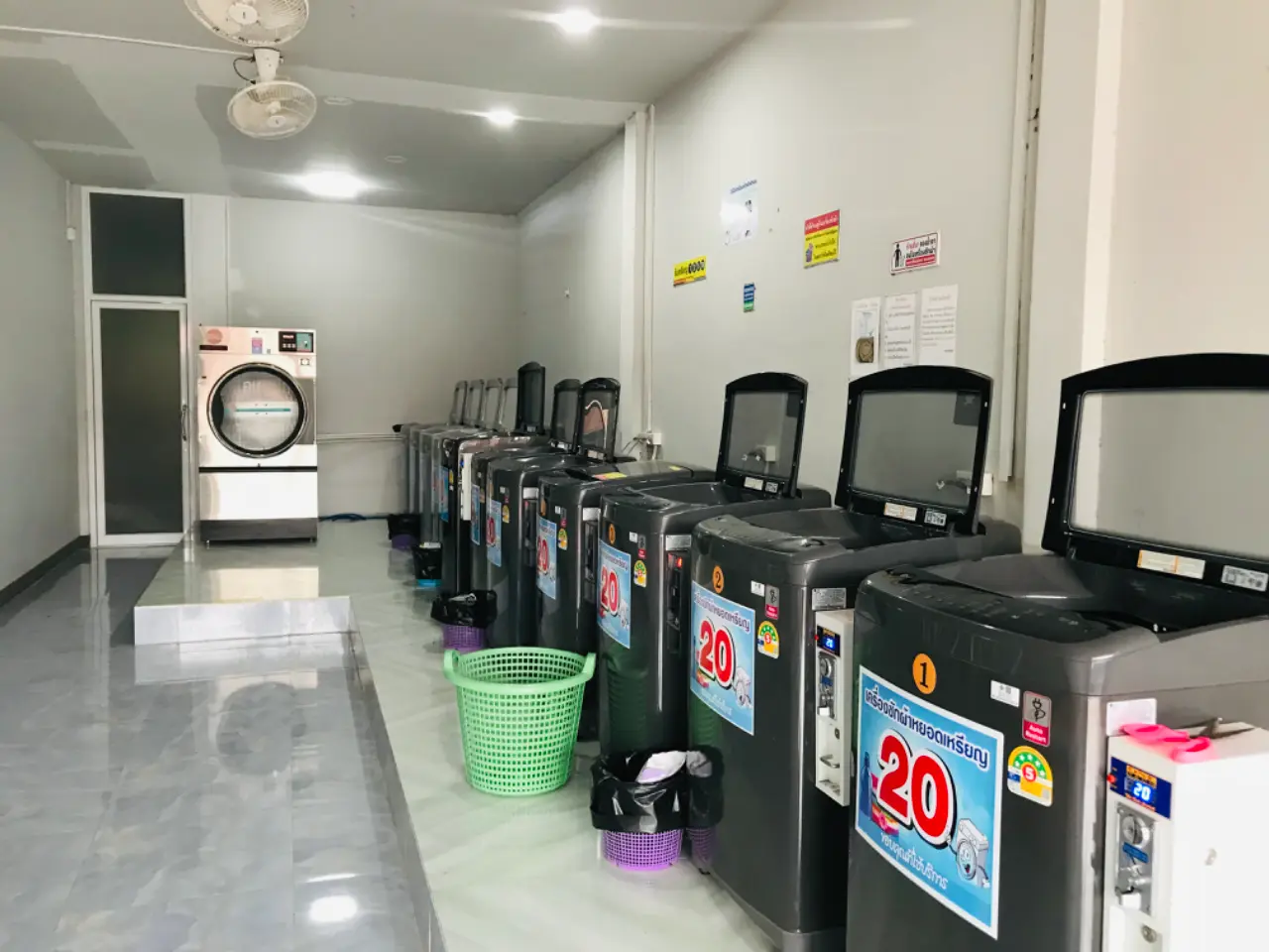 หากว่าเรานั้นไปแล้วในเครื่องไม่มีว่างเลย ยังสามารถที่จะเดินไปสำรวจดูว่าเครื่องไหนเสร็จแล้ว เราจะเดินไปนำตะกร้าเปล่าที่ร้านนั้นเตรียมไว้ให้ หยิบใส่แล้วเราก็ทำการซักต่อได้เลย