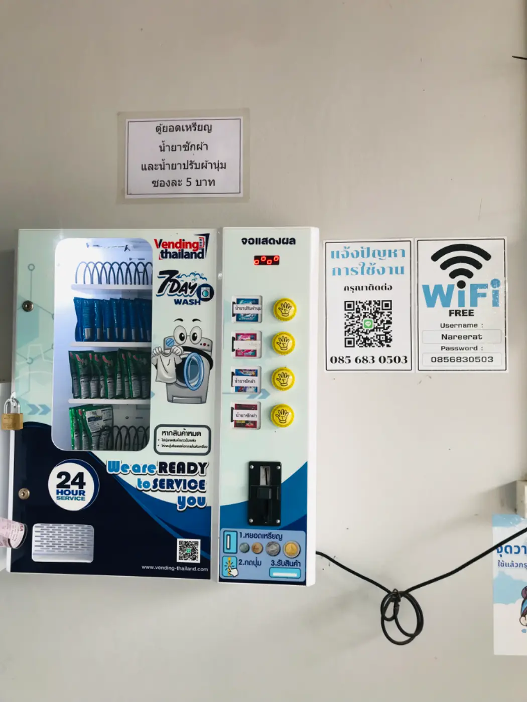 ในการซักนั้นหากว่าเราลืมหรือต้องการเพิ่มในส่วนของน้ำยาซักผ้า ปรับผ้านุ่ม สามรารถนำเหรียญห้าบาทมาหยอดได้ รวดเร็วและไม่ต้องเดินหาร้านหรือวนไปซื้อน้ำยาซักผ้า