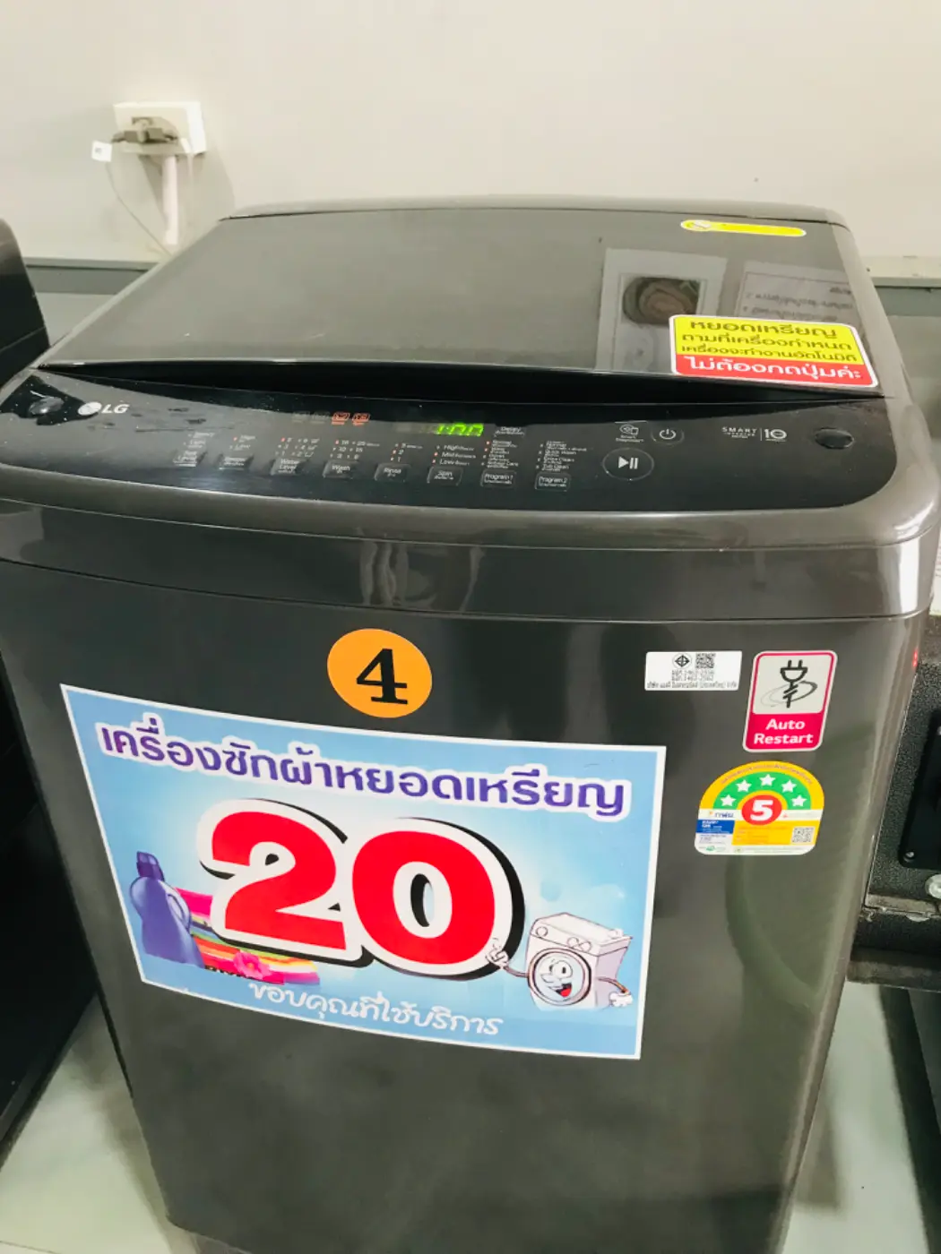 วันนี้เลยเลือกเครื่องที่สี่ราคาในการซักนั้นคือยี่สิบบาท เพราะว่าได้ซักมาจากบ้านแล้ว ตามจริงการซักแบบนี้นั้นจะไม่ค่อยสะอาดมากเท่าไหร่นัก ซักด้วยเครื่องสองถังจะหอมและสะอาดกว่า แต่ว่าไม่มีก็ต้องซัก