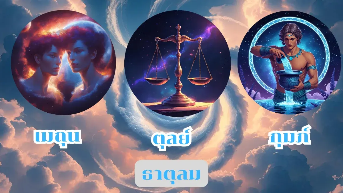 ธาตุลม ประกอบด้วย ราศีเมถุน ราศีตุลย์ และราศีกุมภ์