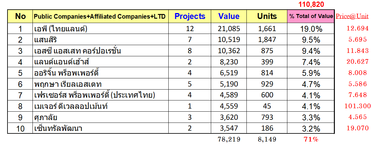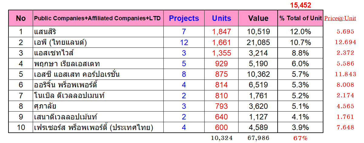 ในแง่จำนวนหน่วยอันดับที่ 1-5 ได้แก่ บมจ.แสนสิริ (1,847 หน่วย) บมจ.เอพี (ไทยแลนด์) (1,661 หน่วย) บมจ.แอสเซทไวส์ (1,355 หน่วย) บมจ.พฤกษาเรียลเอสเตท (929 หน่วย) และ บมจ.เอสซี แอสเสท คอร์ปอเรชั่น (875 หน่วย) ส่วนในแง่มูลค่าปรากฏว่าอันดับ 1-5 ได้แก่ บมจ.เอพี (ไทยแลนด์) (21,085 ล้านบาท) บมจ.แสนสิริ (10,519 ล้านบาท) บมจ.เอสซี แอสเสท คอร์ปอเรชั่น (10,362 ล้านบาท) บมจ.แลนด์แอนด์เฮาส์ (8,230 ล้านบาท) และ บมจ.ออริจิ้น พร็อพเพอร์ตี้ (8,230 ล้านบาท)