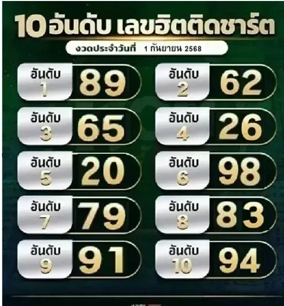 มาแล้ว! "10 อันดับ เลขฮิตติดชาร์ต" งวดวันที่ 1 กันยายน 68..เลขไหนเด็ด ส่องเลย!