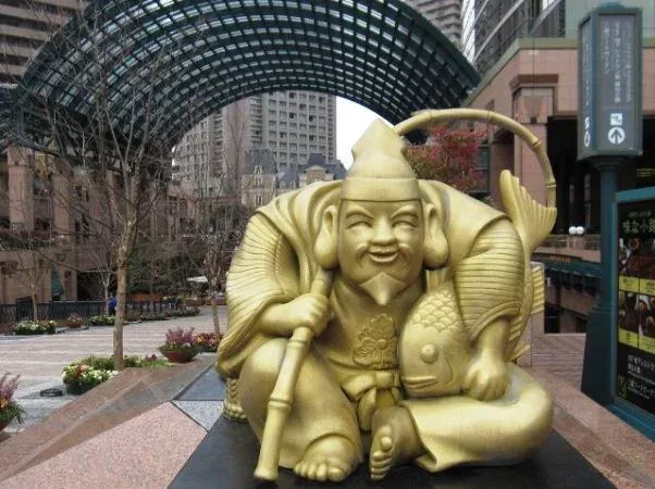 เอบิสึ เทพเจ้าผู้ร่าเริง มักถูกวาดให้มีรูปร่างท้วมและยิ้มแย้มแจ่มใส ด้วยความผูกพันใกล้ชิดกับอาหาร ทำให้รูปปั้นนี้มักพบเห็นได้ตามร้านอาหาร โดยเฉพาะร้านที่เสิรฟ์ปลา ได้ชื่อว่าเป็นเทพแห่งการค้าและการประมง