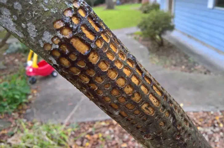 4. นี่เป็นผลงานของนกหัวขวาน (หรือสัตว์ชนิดอื่น) สร้างลวดลายที่น่าสนใจบนต้นไม้ของฉัน