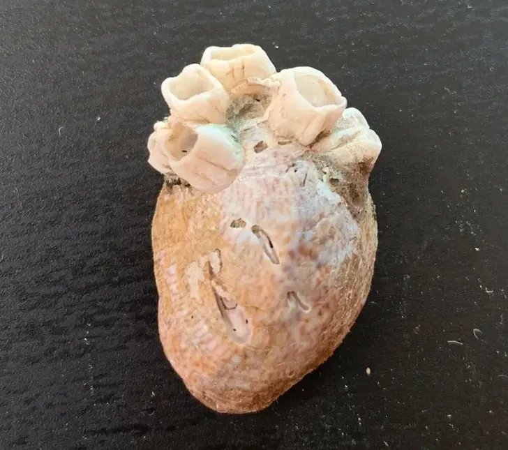 6. ฮีนอยู่ที่ชายหาดและพบเปลือกหอยที่มีเพรียงติดอยู่ซึ่งทำให้มันดูเหมือนหัวใจที่มีโครงสร้างทางกายวิภาคที่ถูกต้อง