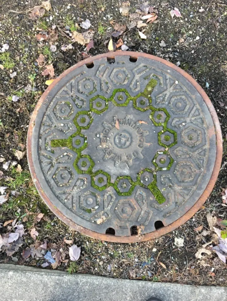 9. นี่เป็นลักษณะของต้นมอสที่เติบโตรอบ ๆ ลวดลายของฝาครอบท่อระบายน้ำ
