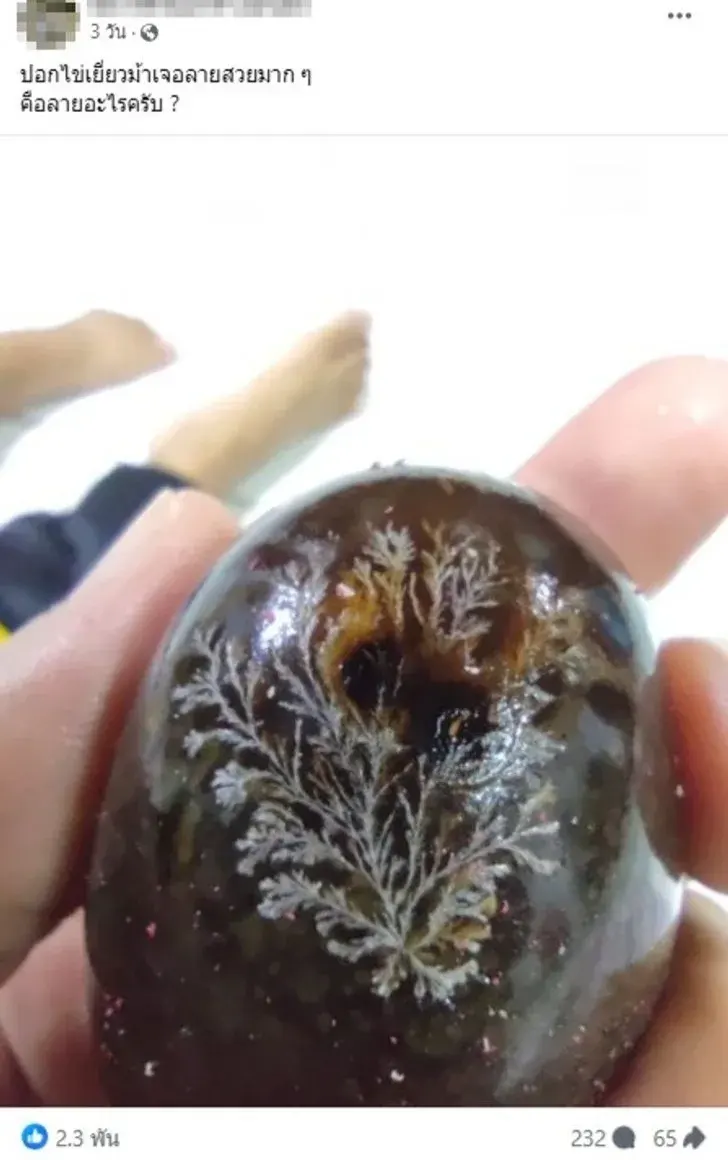 วันนี้ดิฉันมีเรื่องที่น่าสนใจเกี่ยวกับไข่เยี่ยวม้า ที่เชื่อว่าหลายคนอาจเคยสงสัยหรือยังไม่เคยเห็นมาก่อนค่ะ เมื่อไม่นานมานี้ มีคุณผู้ชายท่านหนึ่งโพสต์ภาพไข่เยี่ยวม้าที่เขาปอกแล้วพบว่ามีลวดลายสวยงามมาก ๆ คล้ายกิ่งก้านใบไม้ หรือเป็นผลึกสวย ๆ บนไข่