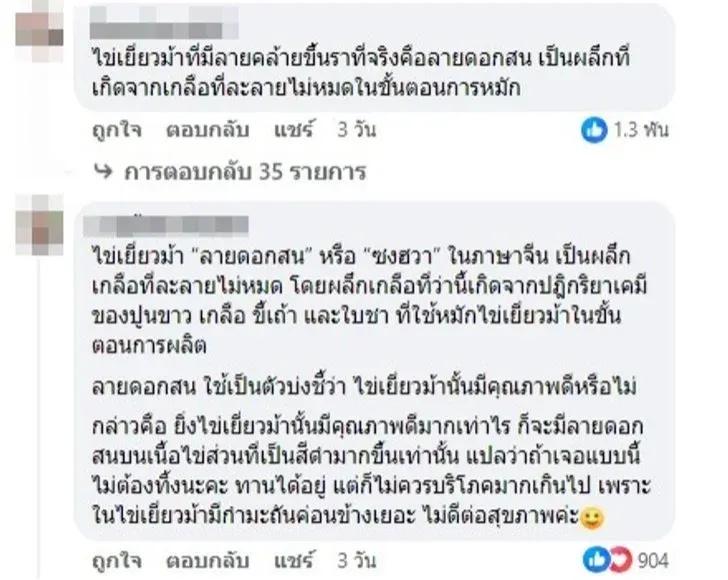 ชาวเน็ตผู้รู้เรื่องไข่เยี่ยวม้าอธิบายว่า ลวดลายดังกล่าวเกิดจาก ผลึกเกลือที่ตกผลึกระหว่างการหมักไข่ ซึ่งเกิดขึ้นจากกระบวนการผลิตแบบโบราณ ลวดลายนี้เรียกว่า “ลายดอกสน” หรือในภาษาจีนเรียกว่า “ซงฮวาตั้น” หมายถึงไข่ใบสน เป็นสัญลักษณ์ของไข่เยี่ยวม้าคุณภาพดี ปลอดสารเคมี และเชื่อกันว่ามีคุณค่าในการบำรุงสุขภาพ