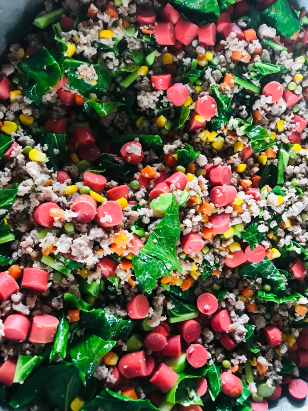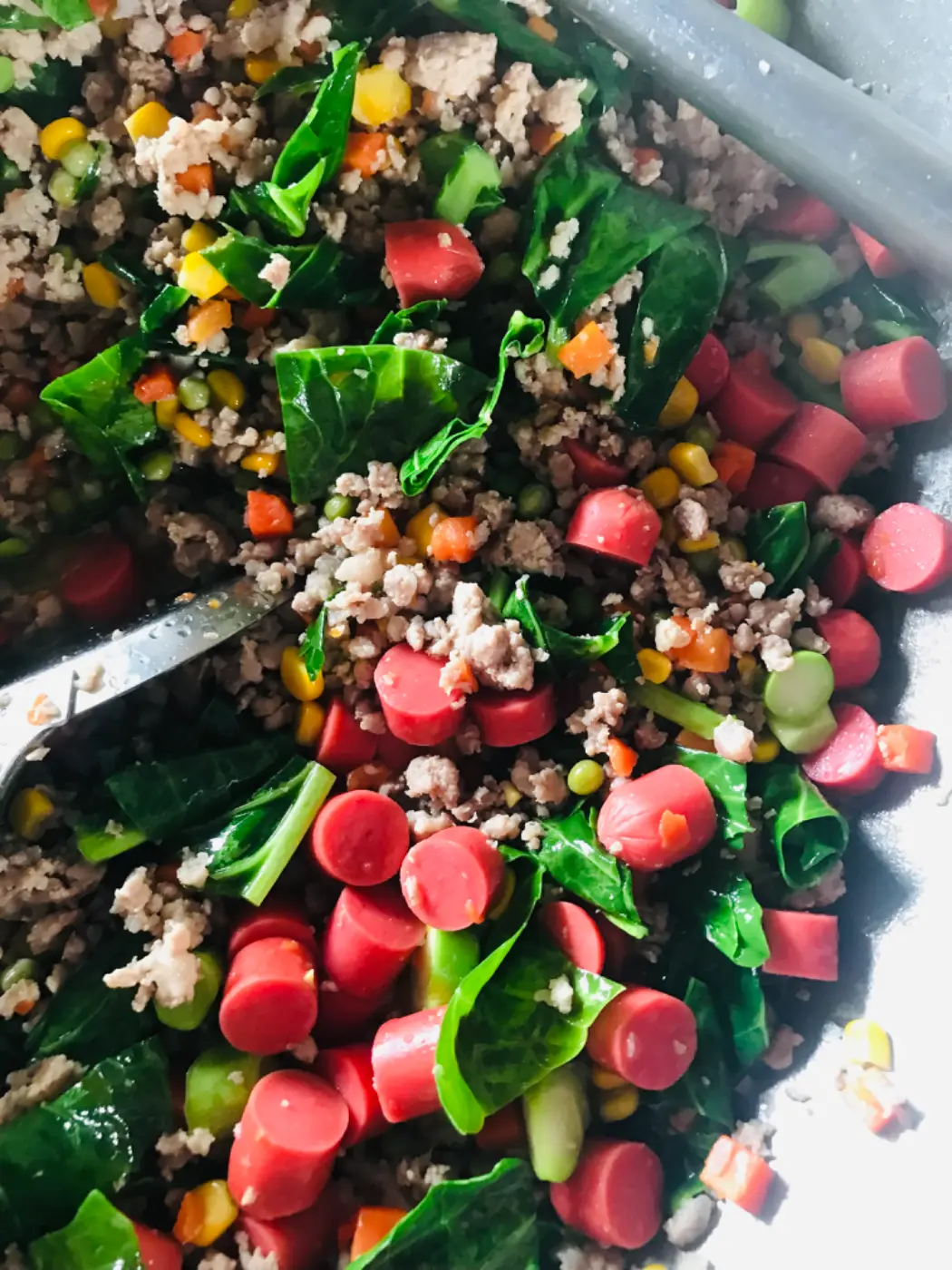 เทน้ำมันลงไปจากนั้นผัดหมู ให้สุก ใส่ข้าวโพด แครอท ถั่วลันเตา และคะน้าลงไป ด้วยความอร่อยเราจะต้องอย่าลืมในการปรุงรสชาติให้อร่อย ด้วยการใส่เกลือซอสฝาเขียว อะไรที่ว่าอร่อยเทราดลงไป ให้กลมกล่อม จากนั้นพยายามชิมในรสชาติหลายอย่าง ว่าเข้ากันหรือยัง อาจจะมีการใส่ในส่วนของเครื่องปรุงหนักกว่า เพื่อที่จะอร่อยแน่นในรสชาติ