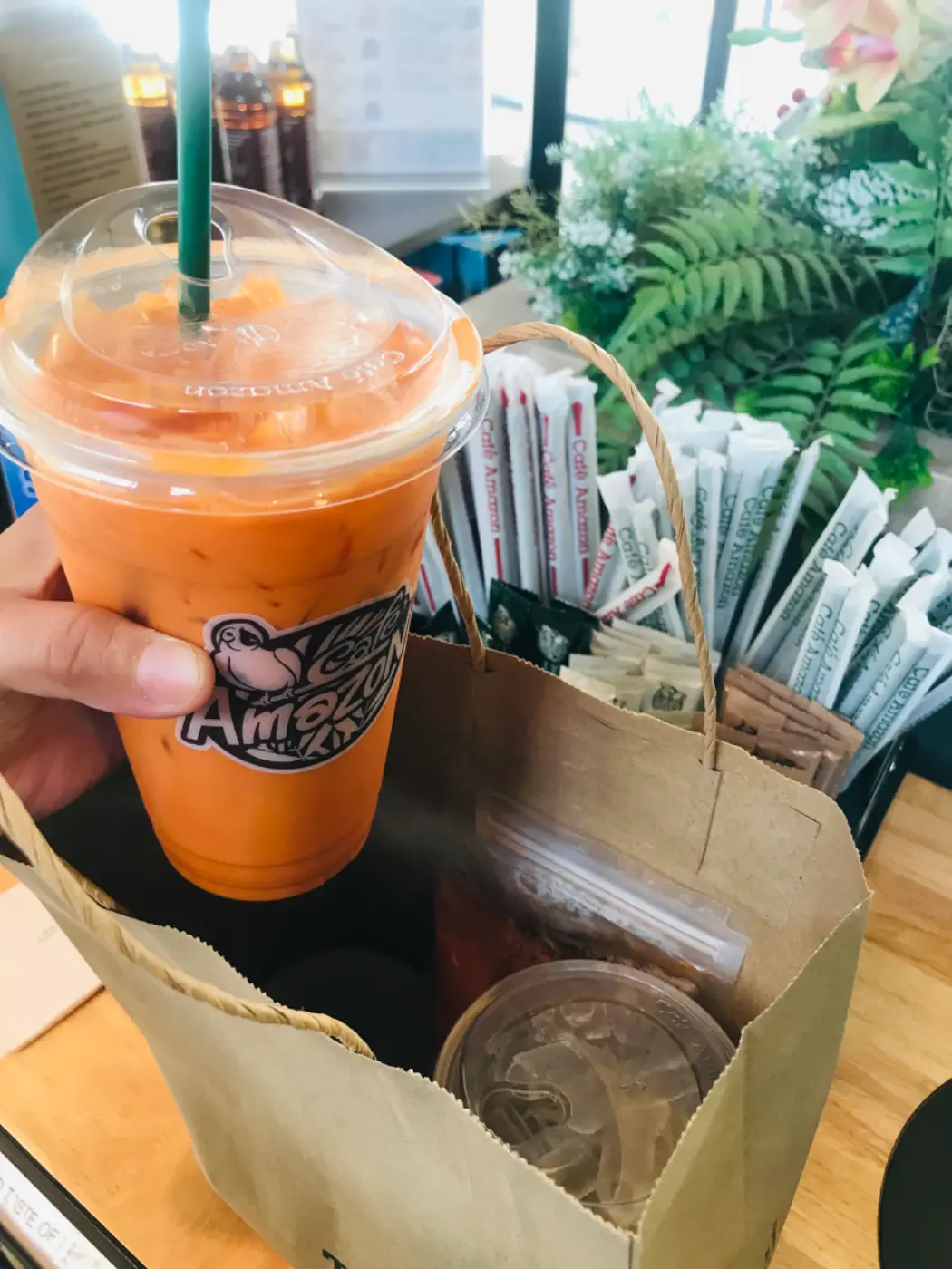 ได้มาแล้วแต่สิ่งที่ต้องรับผิดชอบคือ ชาไทยสองแก้ว จริงแล้วอยากจะบอกว่าการที่เรานั้นทานเลยกับการใส่แก้วกลับบ้านนั้นมันต่างกันมากในรสชสติ เพราะว่าวันนั้นลองชิมแก้วที่กลับบ้านคือ รู้สึกว่าเหมือนมีกาแฟเข้ามาอยู่ในถุงนั้น ทำให้เรานั้นไม่ค่อยอร่อยเหมือนกับที่เรานั้นใส่มาในแก้วพร้อมทานเลย