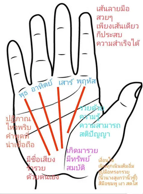 1.เส้นชีวิต เส้นนี้เริ่มต้นจาก ระหว่างห้ามนิ้วหัวแม่มือกับนิ้วชี้ยาวทอดลงมากลางฝ่ามือจะยาวหรือสั้นสุดแต่จะเป็นไปซึ่งมีลักษณะทำนายต่างกัน