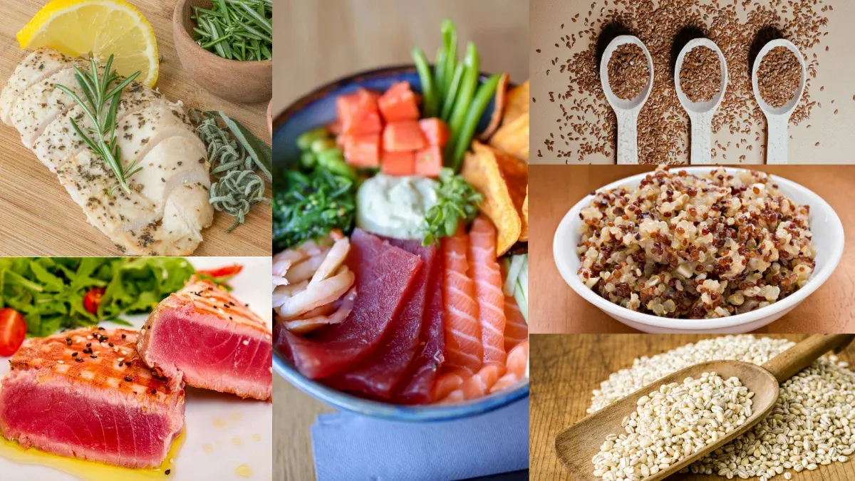 1.อาหารกลุ่มโปรตีน ควรเป็นเนื้อสัตว์ที่มีโปรตีนสูงและมีไขมันชนิดดี เช่น ปลาทูน่า ปลาแซลมอน อกไก่ จำพวกธัญพืชควรเลือกที่มีโปรตีน และ ไฟเบอร์ในปริมาณสูง เช่น เมล็ดแฟลกซ์ คีนัว ข้าวบาร์เล่ย์