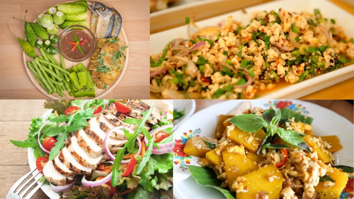 1.ยำขนมจีน มีทั้งคาร์โบไฮเดรตจากเส้นขนมจีน โปรตีนจากปลาทูทอด ไข่ไก่ครึ่งฟอง และ ผักอีกจำนวนหนึ่ง