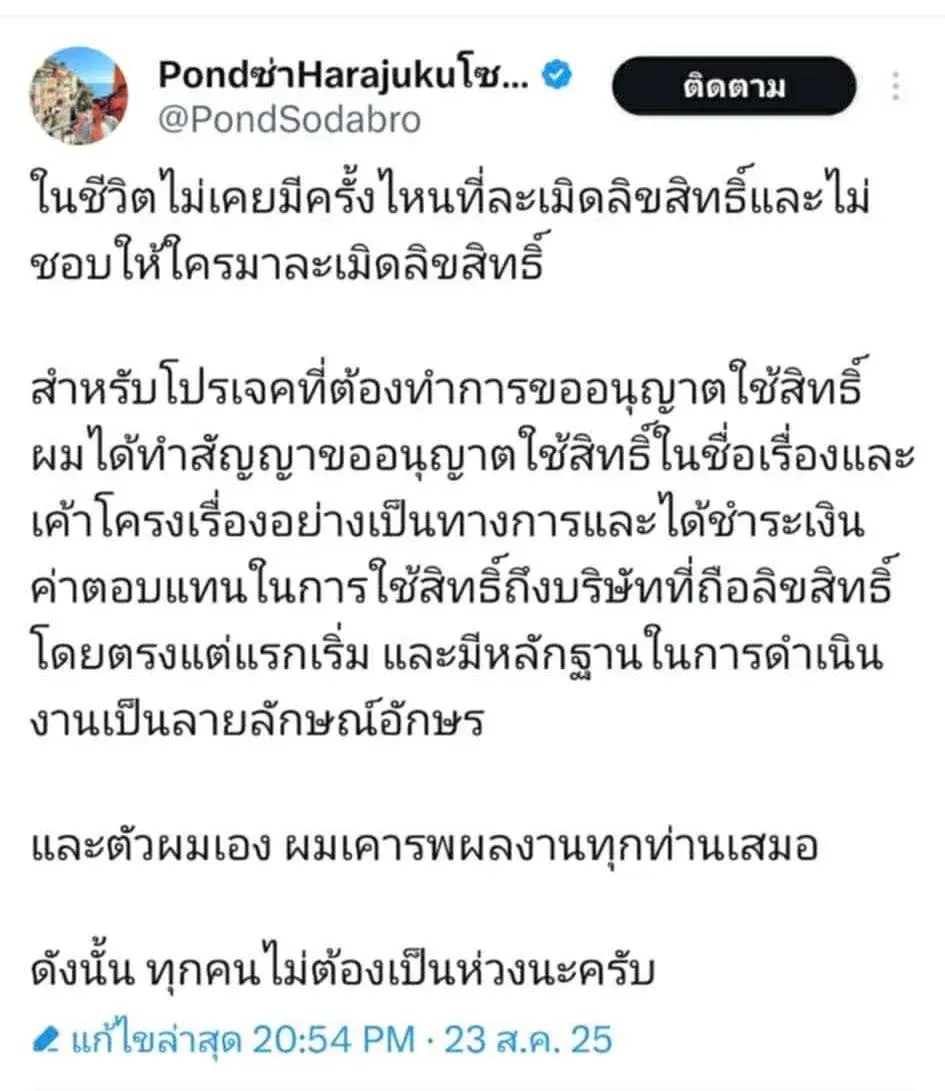 แต่เรื่องยังไม่ทันจบบนจอ ก็มีดราม่าขึ้นมานอกจอ เมื่อ พี่ต้อม ยุทธเลิศ โพสต์ไอจีคล้ายกับกำลังทวงถามเครดิตต้นฉบับที่หายไป งานนี้ร้อนถึง ปอนด์-กฤษดา วิทยาขจรเดช เจ้าของค่าย Be On Cloud ที่ต้องรีบออกมาชี้แจงว่าทางค่ายได้ดำเนินการขอลิขสิทธิ์ถูกต้องตามกฎหมายทุกประการแล้ว งานนี้คงต้องรอดูว่าทั้งสองฝ่ายจะเคลียร์ใจกันได้ลงตัวหรือไม่!