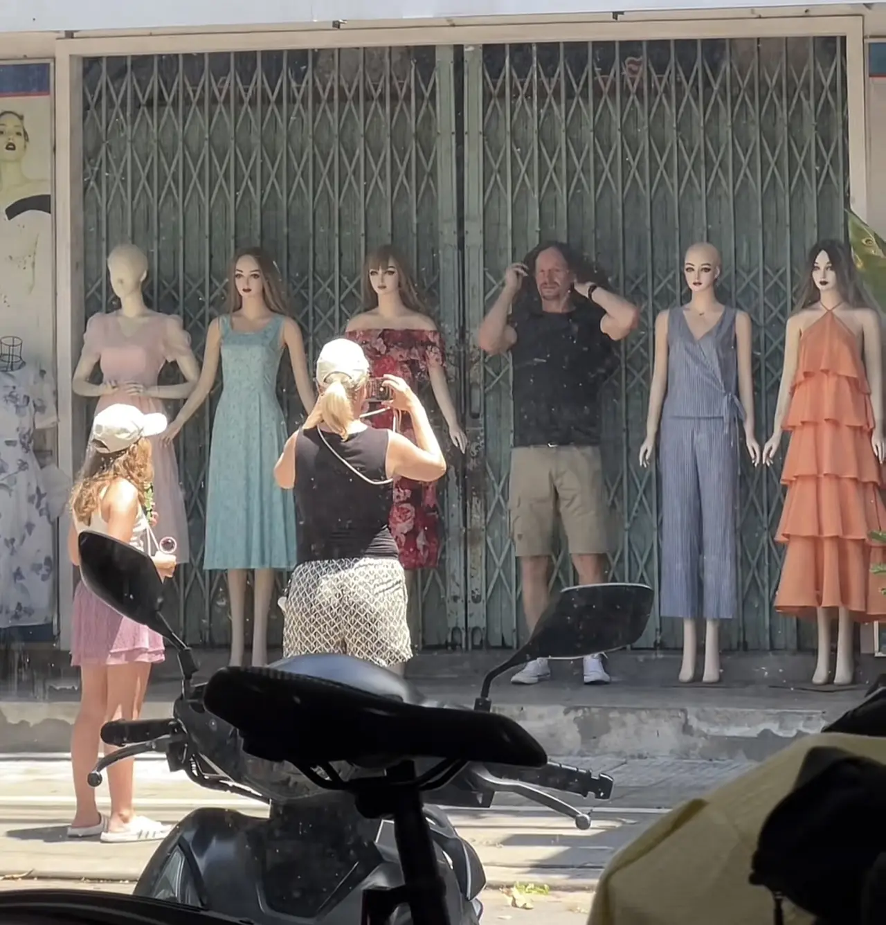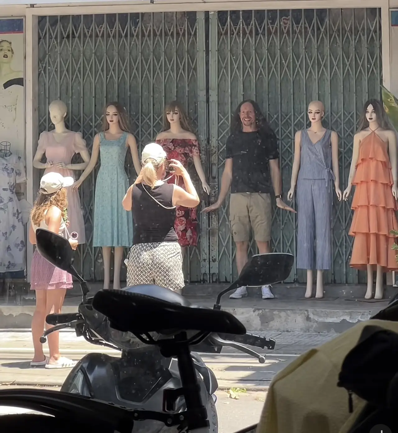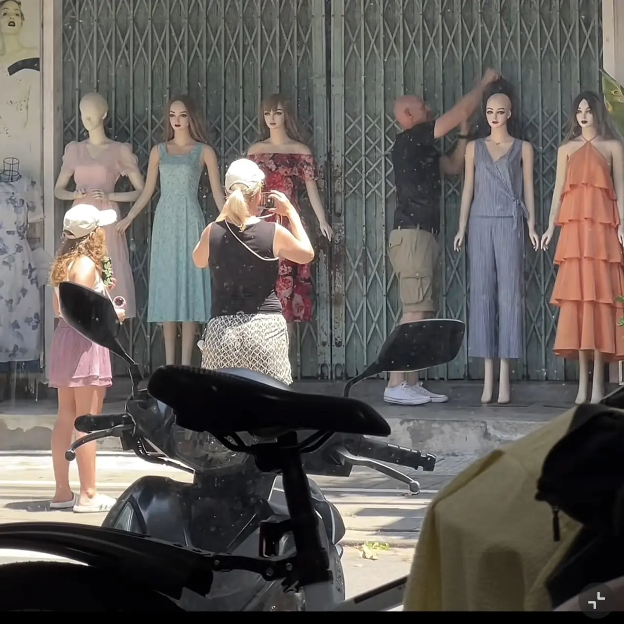 เดินผ่านเห็นหุ่นใส่วิก เขาก็ให้ภรรยาถ่ายรูปให้หน่อย โดยถอดวิกผมจากหุ่นมาใส่ ก่อนจะทำท่าโพสต์เหมือนหุ่นตัวข้าง ๆ แหมเนียนเลยนะพ่อ นี่ฝันอยากเป็นหุ่น หรือฝันอยากมีผมยาวประบ่ากันแน่ 😂