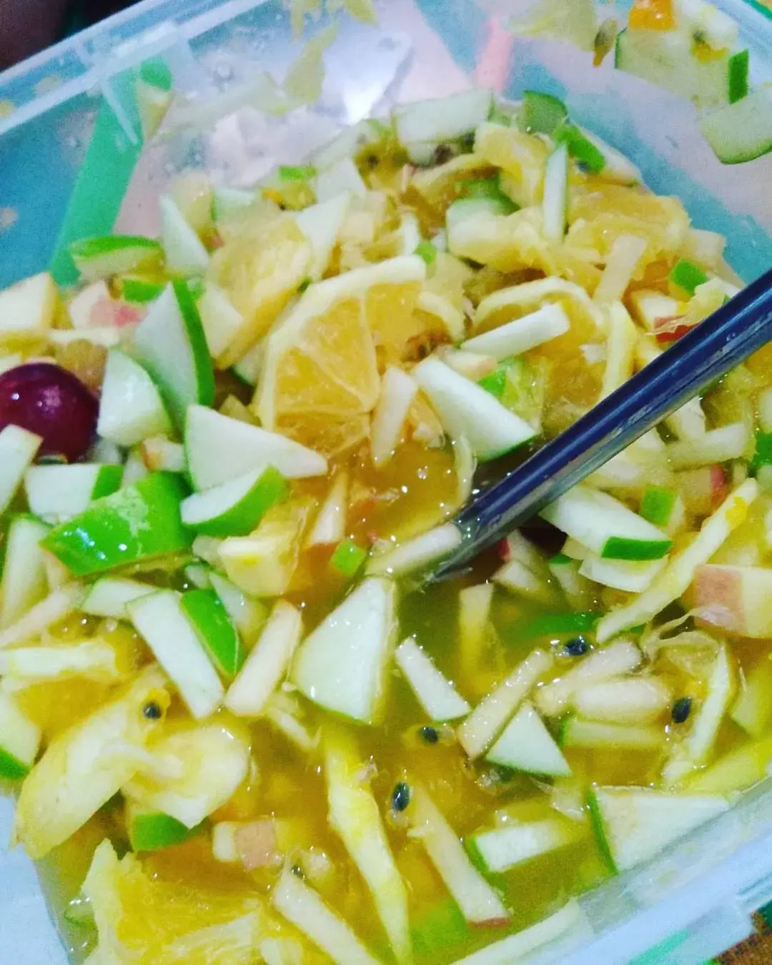 นำผลไม้ทั้งหมดนั้นมารวมกัน ไม่ว่าจะเป็นแอปเปิ้ล สับปะรด เสาวรส แอปเปิ้ลเขียว มะนาว ถือว่าสามารถที่จะนำผลไม้ที่มีรสชาติเปรี้ยวนั้นมาทั้งหมดได้เลย ใส่ลงไปมากเท่าไหร่ยิ่งดี เพื่อที่จะทำให้กลมกล่อมและอร่อยพอดี