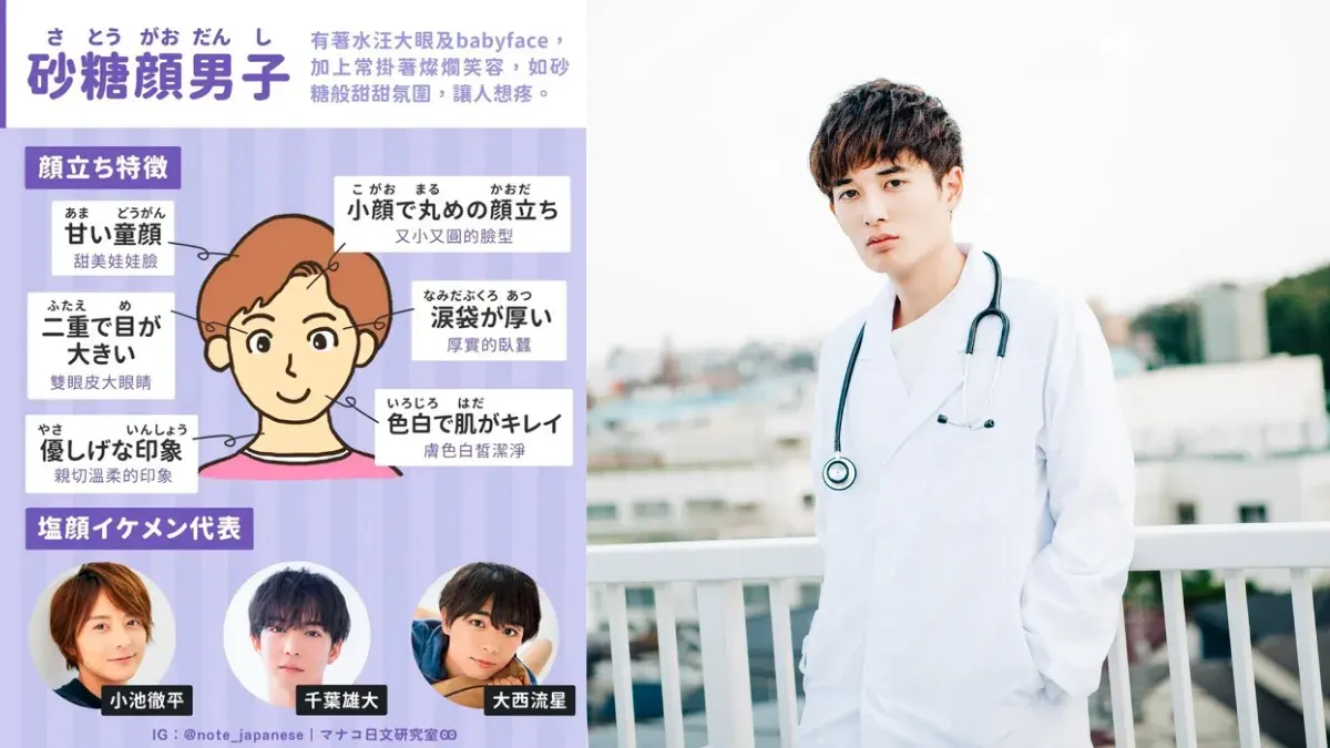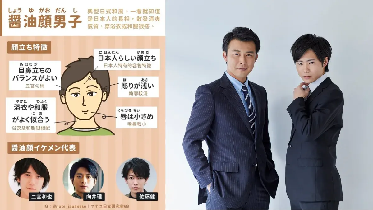 1.หน้าโชยุ (しょうゆ顔) สายคลาสสิก สุขุม นุ่มลึก หน้าแบบหนุ่มญี่ปุ่นต้นฉบับ เห็นปุ๊บรู้ทันทีเลยว่า คนญี่ปุ่นแน่ ๆ ลักษณะเด่น คือ ใบหน้าเรียวเล็ก จมูกค่อนข้างโด่ง หางตาเรียวแหลม หน้าตาออกตี๋นิด ๆ ให้ฟีลพระเอกญี่ปุ่นยุค 90 ดูภูมิฐาน สุขุม นุ่มลึก จัดเป็นใบหน้าที่พบได้บ่อยที่สุดในญี่ปุ่น