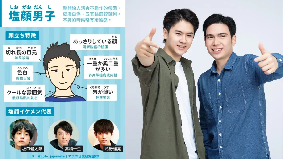 2.หน้าเกลือ (塩顔) สายซอฟต์ หน้าซื่อ แต่คูล หน้าเกลือคือ หนุ่มที่หน้าตาตี๋ ๆ มีตาชั้นเดียวหรือสองชั้นหลบใน จมูกโด่ง ริมฝีปากบาง ผิวขาว ไม่มีหนวด หน้าตาโดยรวมดูสะอาดเกลี้ยงเกลา จืด ๆ หน่อย หน้าเกลือจะดูซอฟต์และละมุน ให้ลุคผู้ชายใจดี อ่อนโยน เป็นใบหน้าพิมพ์นิยมที่สาว ๆ ชื่นชอบในช่วงนี้
