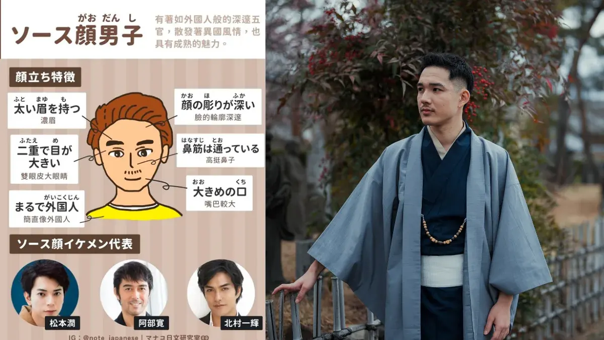 4.หน้าซอส (ソース顔) สายอินเตอร์ เข้มจัดเต็ม “ซอส” ในที่นี้หมายถึง ซอสสีเข้ม ๆ อย่างซอสทงคัตสึ ใช้แทนหนุ่มที่มีใบหน้าคมเข้ม โครงหน้าชัด คิ้วหนา ตาโต จมูกโด่ง ดูแล้วเหมือนลูกครึ่งหรือคนตะวันตก ให้ลุคหนุ่มเข้มมาดเท่ เป็นหนุ่มฮอตที่สาว ๆ หลายคนชื่นชอบกันไม่น้อย
