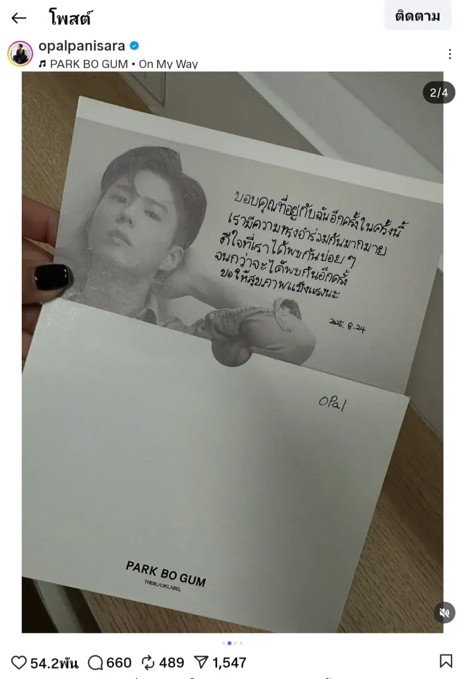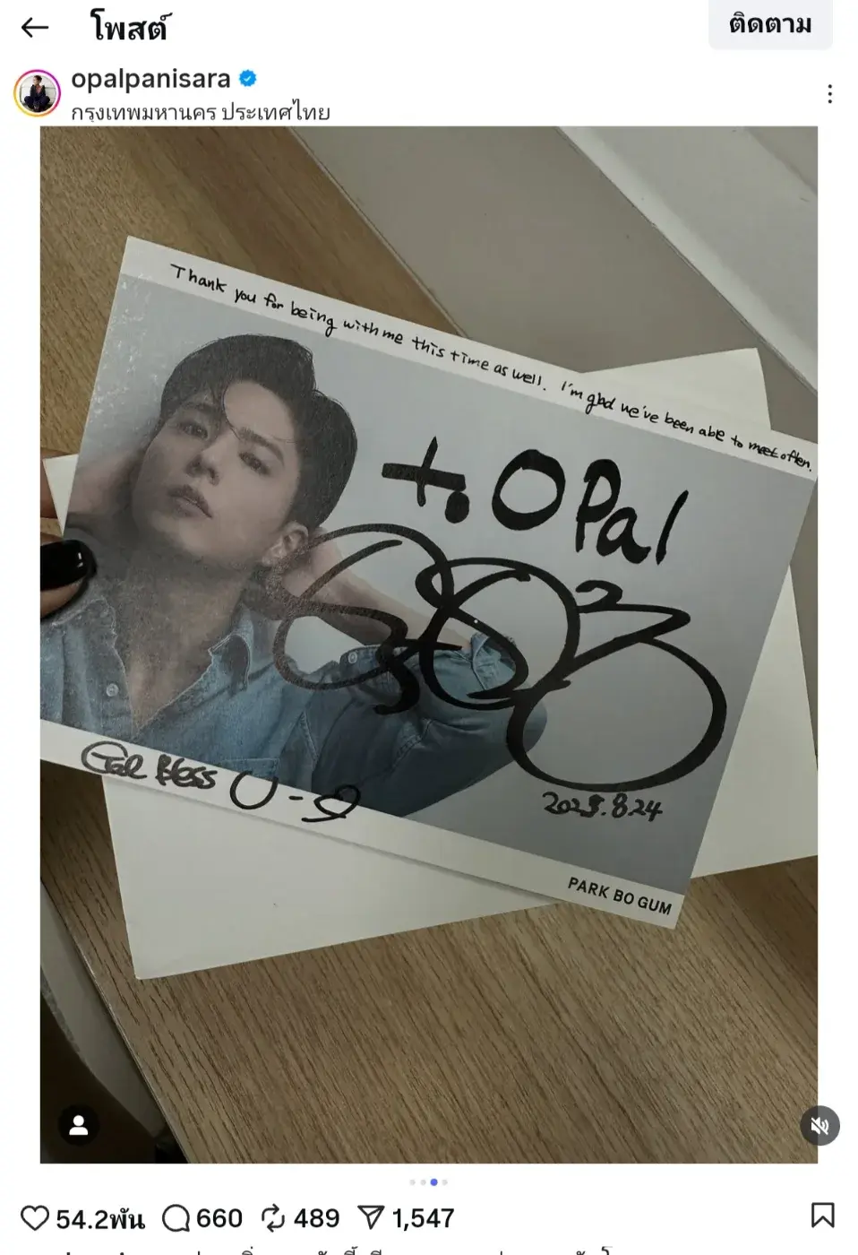 หลังจากนั้น โบกอมก็ได้ยื่น การ์ดลายมือที่เจ้าตัวตั้งใจเขียนเป็นภาษาไทยเองกับมือ เพื่อขอบคุณโอปอล์ที่มารับหน้าที่ MC ในงานนี้ โดยโอปอล์เล่าผ่านอินสตาแกรม @opalpanisara ว่า“โบกอมที่น่ารักเคาะประตูเข้ามาหา ยื่นการ์ดนี้ให้ และบอกว่าตั้งใจเขียนแทนคำขอบคุณที่วันนี้อุตส่าห์มาเจอกัน เนี่ยยยยแล้วจะไม่ให้รักได้ยังไง”