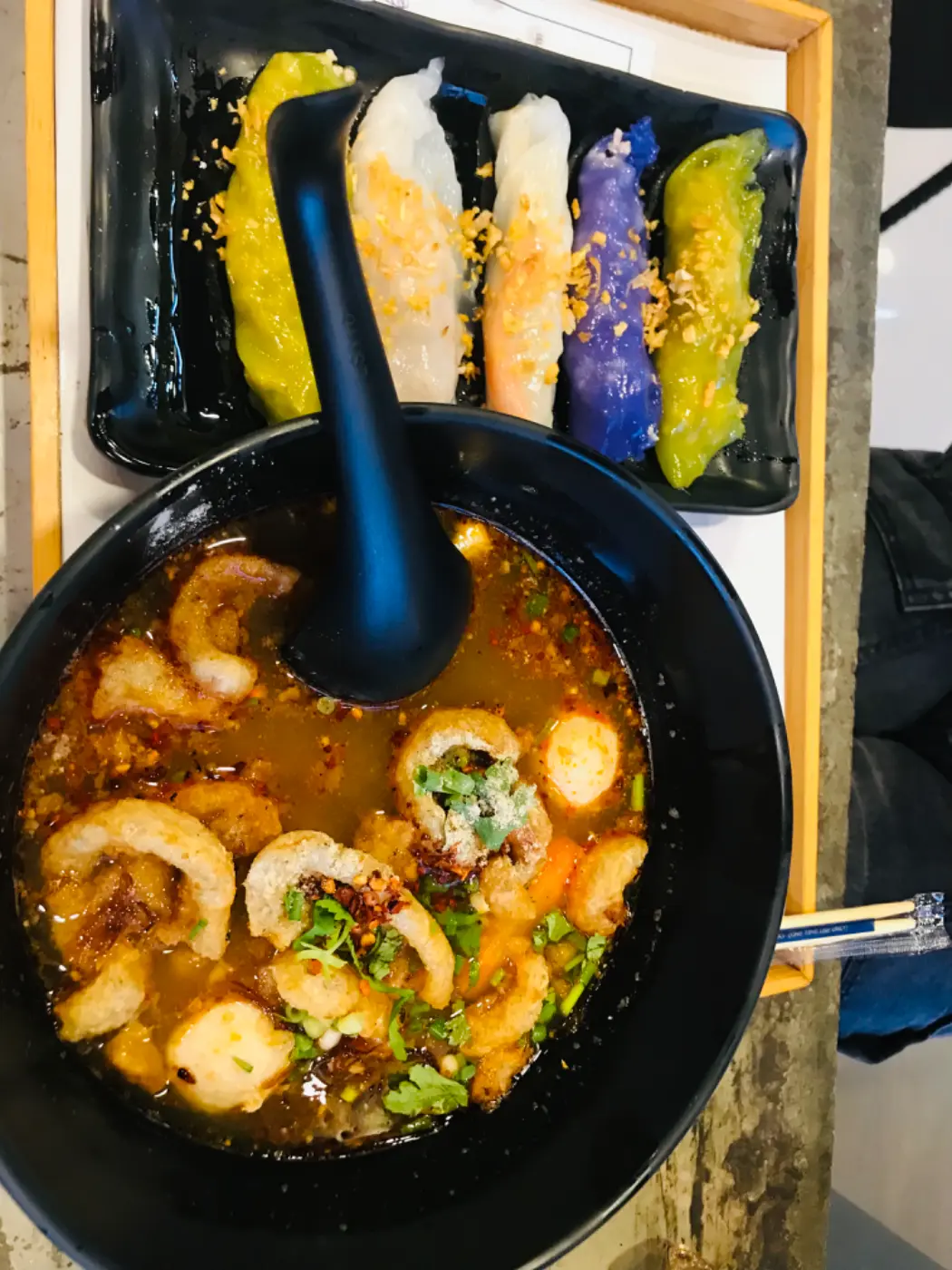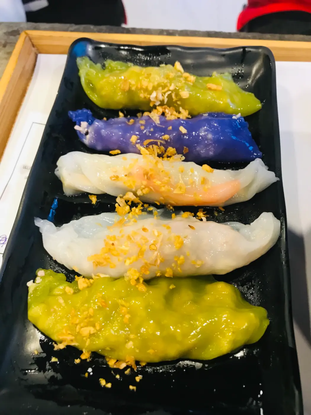 สิ่งที่อร่อย ต้องถาดนี้ เป็นถาดที่เรานั้นเลือกไส้เองว่าเราจะทานไส้อะไร แล้วเจ้าของร้านจะเป็นคนที่ จัดสีของแป้งให้เราเอง แป้งสีขาวไส้อะไร แป้งสีม่วงไส้อะไรหรือว่าจะเลือกไส้เดียวทั้งหมดแต่แป้งนั้นคนละสี เนื้อของปากหม้อนั้นนิ่มอร่อยมาก อีกอย่างคือหมู รวมถึงไส้ปูอัด ไส้กุ้งที่อร่อยได้อย่างลงตัว