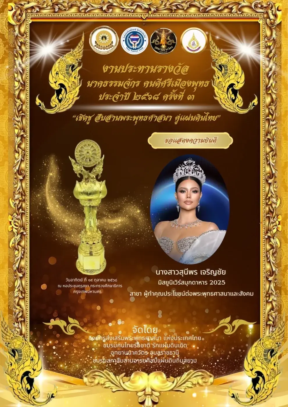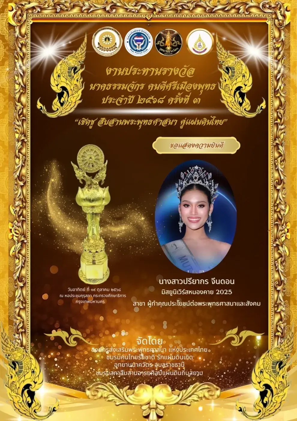 คนดีศรีเมืองพุทธ ประจำปี 2568 ครั้งที่ 3 ในสาขารางวัล ผู้ทำคุณประโยชน์ต่อพระพุทธศาสนาและสังคม ต้องขอแสดงความชื่นชมกับทั้งสามสาวของขุ่นแม่เอ็มมี่โก๊ะ ด้วยนะคะ