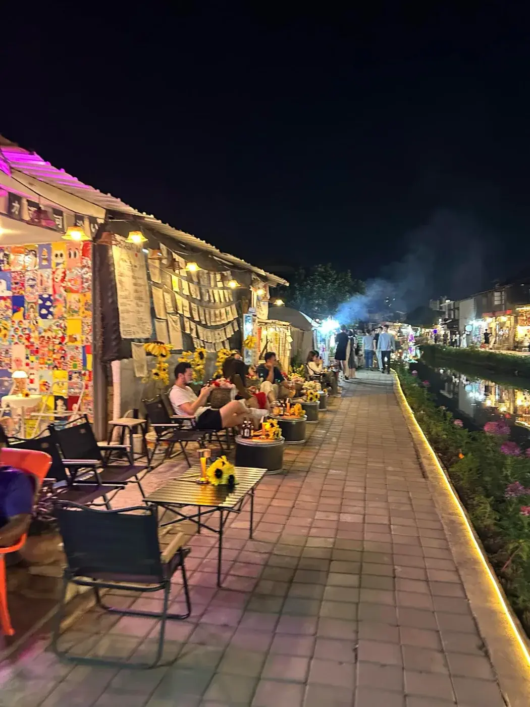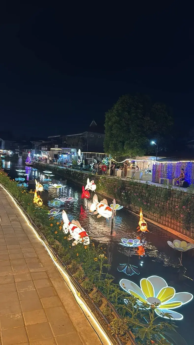 สายน้ำยามค่ำคืนยังคงสวยงาม เพราะว่ามีการตกแต่งด้วยดอกไม้บ้าง ปลาบ้าง แสงสีเสียงนั้นมีครบหมด ไม่ว่าเรานั้นจะเดินไปตรงไหน การสร้างหรือให้ความสวยงามนั้นมีเสมอ น้ำที่ใสและไหลเย็นเป็นเหมือนเช่นที่เรานั้นได้มองเห็น แสงไฟส่องให้ความสว่างตลอดการเดินบนถนน