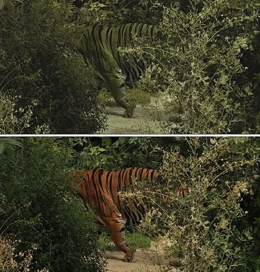 รื่องนี้ยังมีอีกมุมที่น่าสนใจคือ มนุษย์บางคนที่มีความบกพร่องทางการมองเห็นสี หรือที่เราเรียกกันว่า “ตาบอดสี” โดยเฉพาะผู้ที่มีการมองเห็นใกล้เคียงแบบ Dichromats ก็จะรับรู้โลกไม่ต่างไปจากกวางหรือหมูป่า สำหรับพวกเขา สีส้มของเสือไม่ได้โดดเด่นเลย หากแต่มองเห็นเป็นเพียงร่างหม่น ๆ ที่สอดประสานไปกับสภาพแวดล้อมรอบตัว การทดลองหลายครั้งที่ใช้ซอฟต์แวร์จำลองการมองเห็นของผู้ที่ตาบอดสีจึงเผยให้เห็นความจริงที่น่าทึ่งว่า เสือโคร่งในสายตาของพวกเขาแทบจะมองไม่ออกจากเงาของต้นไม้