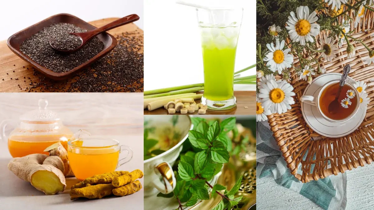 4.ขิง จินเจอรอลที่อยู่ในขิงเป็นสารฟีนอลชนิดหนึ่ง มีคุณสมบัติช่วยลดอาการท้องอืด ท้องเฟ้อ แนะนำให้ดื่มเป็นน้ำขิงร้อนหวานน้อย หรือ ไม่ใส่น้ำตาลจะดีที่สุด นอกจากนี้ยังสามารถเลือกดื่มน้ำตะไคร้ ชาเปปเปอร์มินต์ ชาคาโมมายล์ ชาใบกะเพรา ที่มีสรรพคุณช่วยย่อยอาหาร บรรเทาอาการท้องอืด ท้องเฟ้อ ขับลม จะทำให้รู้สึกสบายตัวขึ้น