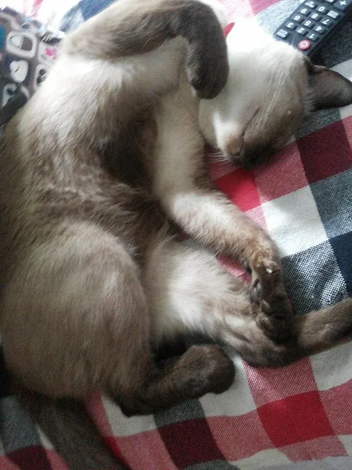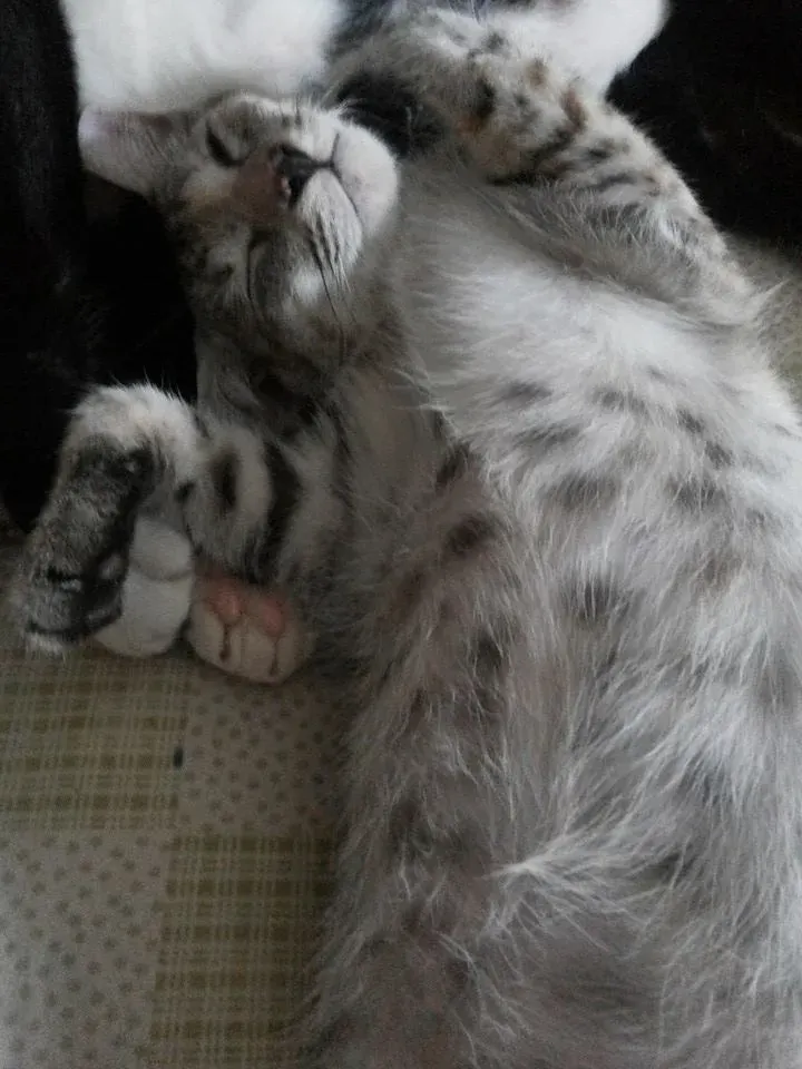 ตัวนี้ก็เหมือนกัน ชอบที่จะนอนใกล้เราแล้วอ้าขาเพื่อที่ต้องการให้เรานั้นเข้าไปเล่นด้วย ขาของนางคือนอนหดมาก ชอบนอนหน้าอกเหมือนกัน ในการเลี้ยงแมวนั้นเราจะไม่รู้สึกเหงาอีกต่อไป และมากกว่านั้นคือแมวจะไม่ชอบนอนในตอนกลางคืน หากว่าเรานั้นทำงานเจ้าแมวจะมานั่งรอเรา นั่งมอง นอนเฝ้า และเดินไปกินข้าว พอเรานั้นเข้านอนเท่านั้นแมวก็จะมาหาและนอนด้วยคน