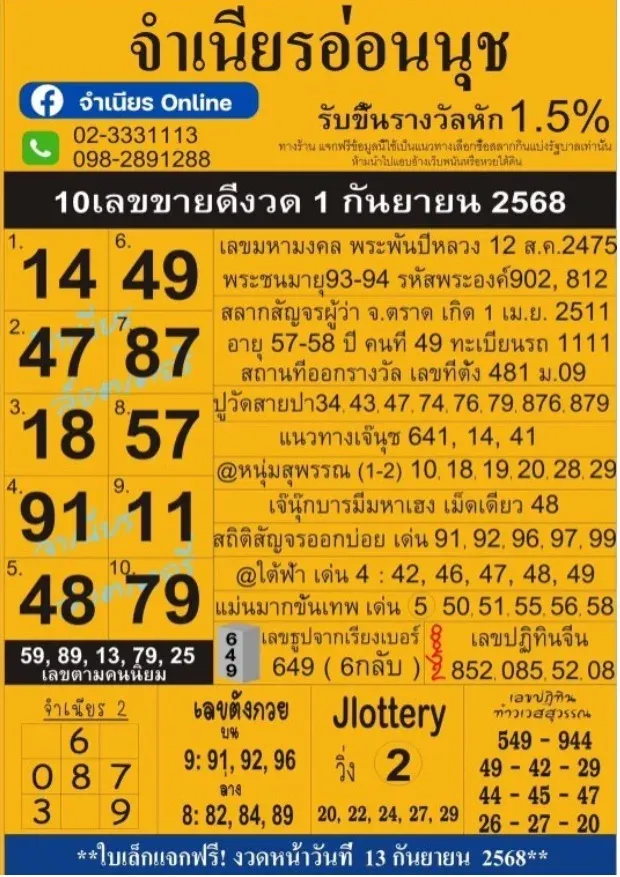 10 เลขขายดี "จำเนียรอ่อนนุช" งวดวันที่ 1 กันยายน 68 มาแล้ว!..คอหวยส่องด่วน!!
