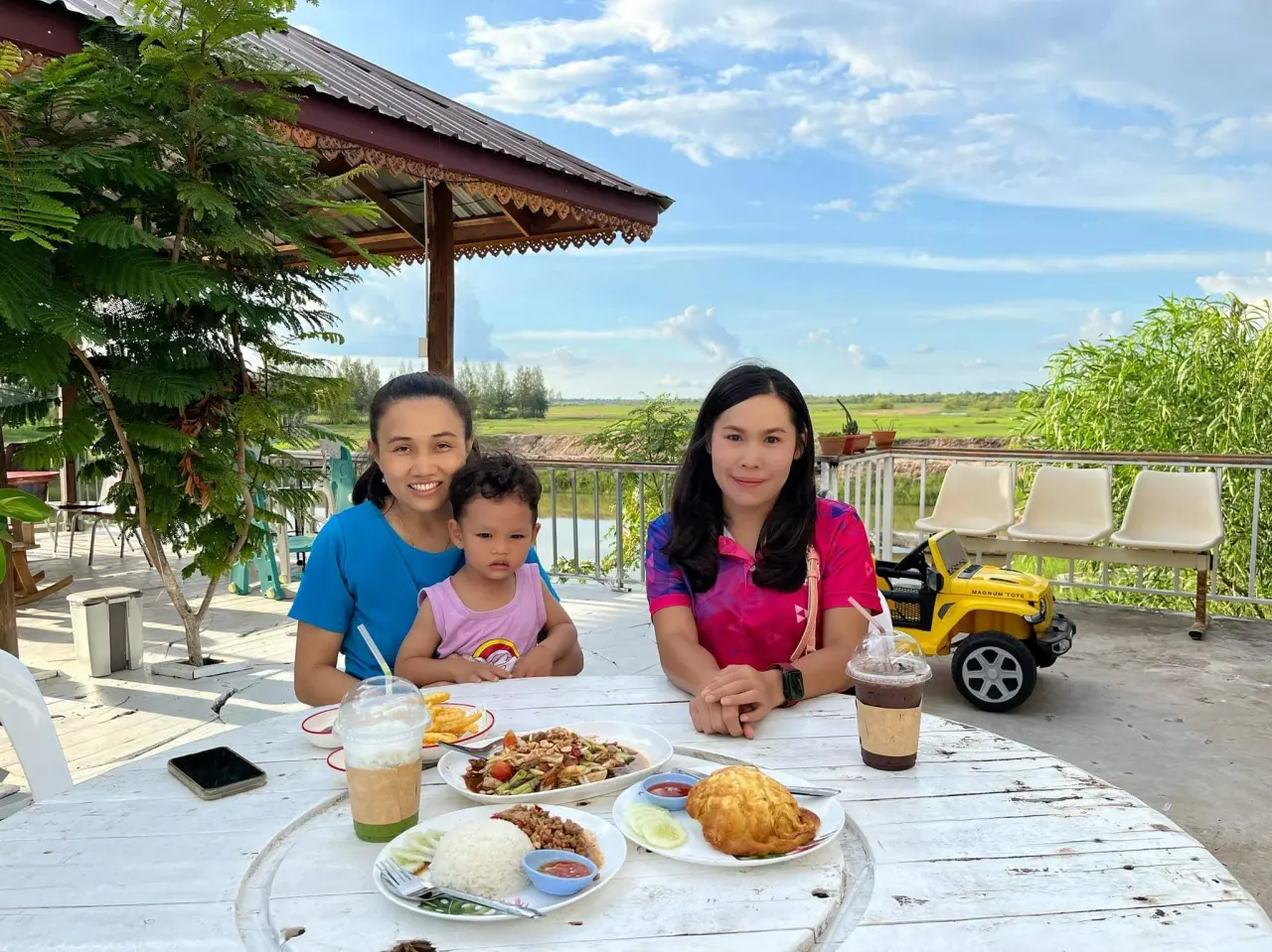 ระหว่างที่เรานั้นรออาหาร สิ่งที่ทำฆ่าเวลาคือการถ่ายภาพเพราะว่าสวยมากวิวด้านหลัง บรรยากาศหลักล้านมาก ตรงที่เรานั้นเดินมาทานข้าวตรงนี้เป็นพื้นที่ย่นออกมาจากตัวร้าน ยังมีซุ้มในการทานอาหาร หากว่าเรานั้นพาเด็กมาด้วย มีมุมให้เล่นสนุกมีรถของเด็กน้อยสำหรับนั่งเล่น สบายไม่ต้องห่วงในส่วนของบ่อน้ำด้านล่างนั้นมีที่กลั้นให้ ปลอดภัยหากว่าเรานั้นเห็นในสายตา
