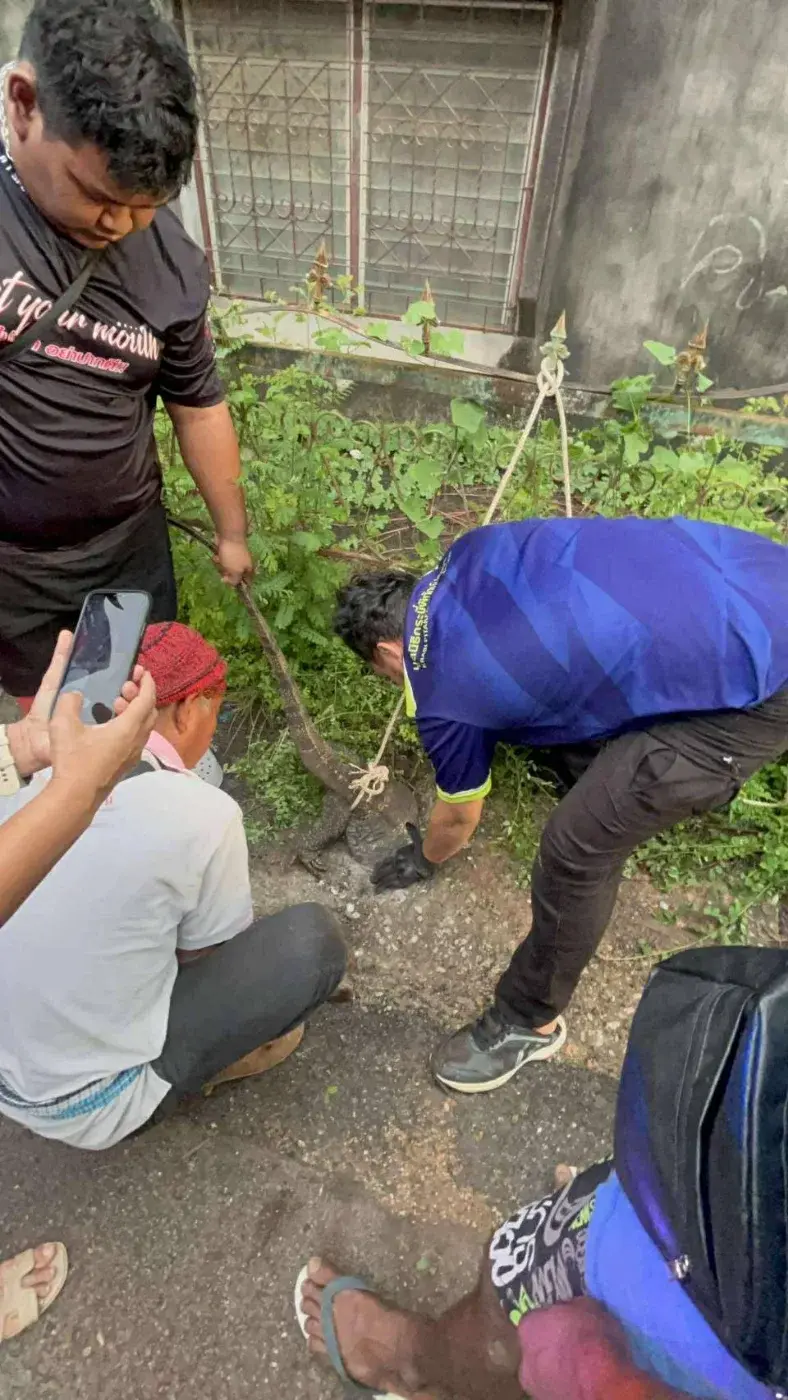 จากการสอบถามชาวบ้านทราบว่า เ...้ยตัวดังกล่าวถูกสุนัขไล่จนหนีหัวซุกหัวซุน ก่อนพลาดมุดท่อแล้วติดคา โผล่มาเพียงครึ่งตัว ชาวบ้านแม้จะสงสารแต่ไม่กล้าเข้าไปช่วยด้วยตนเอง จึงรีบแจ้งกู้ภัยมาช่วยเหลืออย่างปลอดภัย
