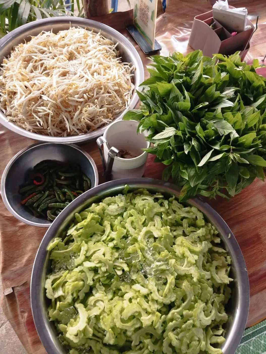 ในส่วนของผักนั้นแน่นอน ว่าสิ่งที่ขาดไม่ได้หากว่าเรานั้นทานในส่วนของก๋วยเตี๋ยวไก่นั่นคือมะระ เพื่อนำไปตัดในความหวาน ขมบ้างอร่อยพอดี ถั่วงอกก็อร่อย และมีในส่วนของพริกสด หากว่าไม่พอในความเผ็ด คนเรานั้นชอบไม่เหมือนกัน บางคนนั้นก็ชอบขม บางคนชอบเผ็ด บางคนนั้นก็ชอบในความหอมของ โหระพา น่องไก้และตรีนไก่ตุ๋นเช่นกัน แต่ละคนนั้นจะมีปริมาณ ในส่วนของตนเอง จะไม่ทานจนท้องแตกแน่นอน