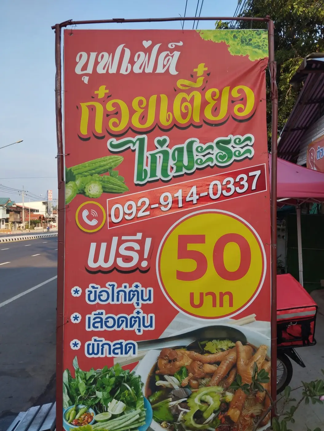 หากว่าใครสนใจที่จะมาลองในการทานก๋วยเตี๋ยวไก่มะระ ปุฟเฟต์ในราคาเหมา 50 บาทนั้นสามารถที่จะเดินทางมาทานได้แถวชนบท ไม่ไหลเปิดทุกวัน บางวันนั้นก็จะมีเลือดตุ๋น ผักฟรีตลอดทุกวัน บางวันมีในส่วนของข้อตุ๋น น่องตุ๋นแล้วแต่ความชอบ บางวันก็หาไม่ได้ ก็จะเปลี่ยน แต่ว่าในส่วนของเลือดนั้นมีในทุกวัน