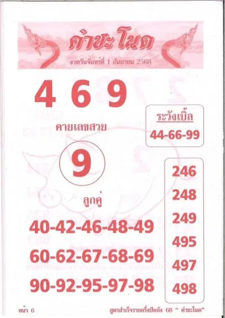 สำหรับงวดนี้ เลขจากสำนัก คําชะโนดได้ให้แนวทางเด่นชัดเจน โดยมีเลขเด่นหลักอยู่ที่ 4 – 6 – 9 และมี เลข 9 เป็นจุดศูนย์กลางของโชคลาภ ถือเป็น “ลูกคู่” ที่น่าสนใจ