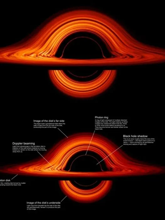 ฝุ่น แก๊ส และวัตถุในอวกาศที่อยู่รอบ ๆ จะถูกแรงโน้มถ่วงมหาศาลของหลุมดำดึงดูดเข้าไปอย่างไม่อาจต้านทานได้ เมื่อวัตถุเหล่านี้เคลื่อนเข้าใกล้ใจกลางมากขึ้น ความเร็วและอุณหภูมิก็ยิ่งสูงขึ้นจนปลดปล่อยพลังงานออกมาเป็นแสงสีส้มสว่างที่เรามองเห็นเป็นวงแหวนรอบ ๆ หลุมดำ แต่สิ่งที่น่าพิศวงยิ่งกว่าคือ เมื่อเราขยับมุมมองไปอีกด้าน แสงเหล่านี้กลับถูกบิดเบือนและเปลี่ยนรูปร่างตามแรงโน้มถ่วงอันรุนแรงของหลุมดำเอง ส่งผลให้ ไม่ว่ามองจากมุมไหน เราก็ยังเห็นวงแหวนสีส้มโอบรอบอยู่เสมอ