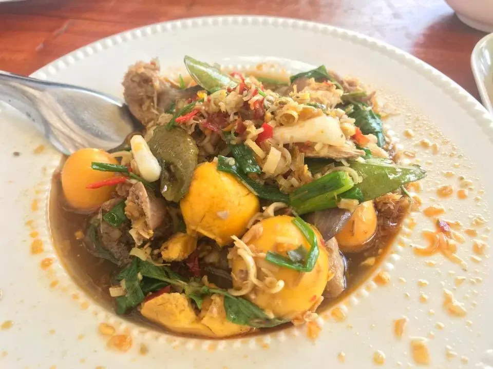 ตอนที่มาทานนั้นคนสั่งบอกว่าต้องลองเมนูนี้เลย พอเรานั้นมองเหมือนว่าไข่แดง แต่ไม่ใช่ไข่แดงจริง คือไข่ที่แม่ไก่นั้นพร้อมจะฟักหรือว่าบางที่นั้นจะเอาไข่ไก่ที่ฟักไม่ออก หรือว่าเรียกว่าไข่ลูกไก่ ที่จะเอาไข่ที่กำลังจะเป็นตัวมา จากนั้นก็จะนำท้องของไก่นั้นออกมาด้วยหลากหลายอย่าง ในส่่วนของตัวที่สามารถที่จะกินได้ก็นำมาใส่ ส่วนที่ไม่ได้ก็ปล่อยทิ้งหรือว่านำมาทำอาหารร่วมกัน รสชาตินั้นมีความหลากหลาย อร่อยรสชาติกลมกล่อมดี ลองมาชิมมันเหมือนกันกับการคั่วไก่แล้วใส่กับสมุนไพร แต่รสชาตินั้นไม่ได้เผ็ดมาก เป็นรสชาติมันๆ