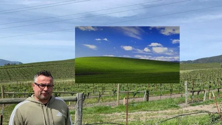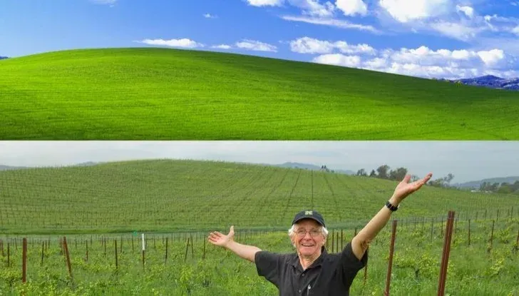 ทราบมาว่า ภาพนี้ถ่ายโดยคุณ Charles O’Rear ช่างภาพมืออาชีพ ซึ่งเคยทำงานกับ National Geographic สถานที่ถ่ายก็อยู่ที่รัฐแคลิฟอร์เนีย สหรัฐอเมริกา เมื่อปี ค.ศ. 1996 ตอนนั้นพื้นที่ตรงนั้นเคยเป็นไร่องุ่นมาก่อน แต่ถูกถอนออกเพราะโรคพืช เหลือเป็นทุ่งหญ้าสีเขียวสวยงามตามธรรมชาติ