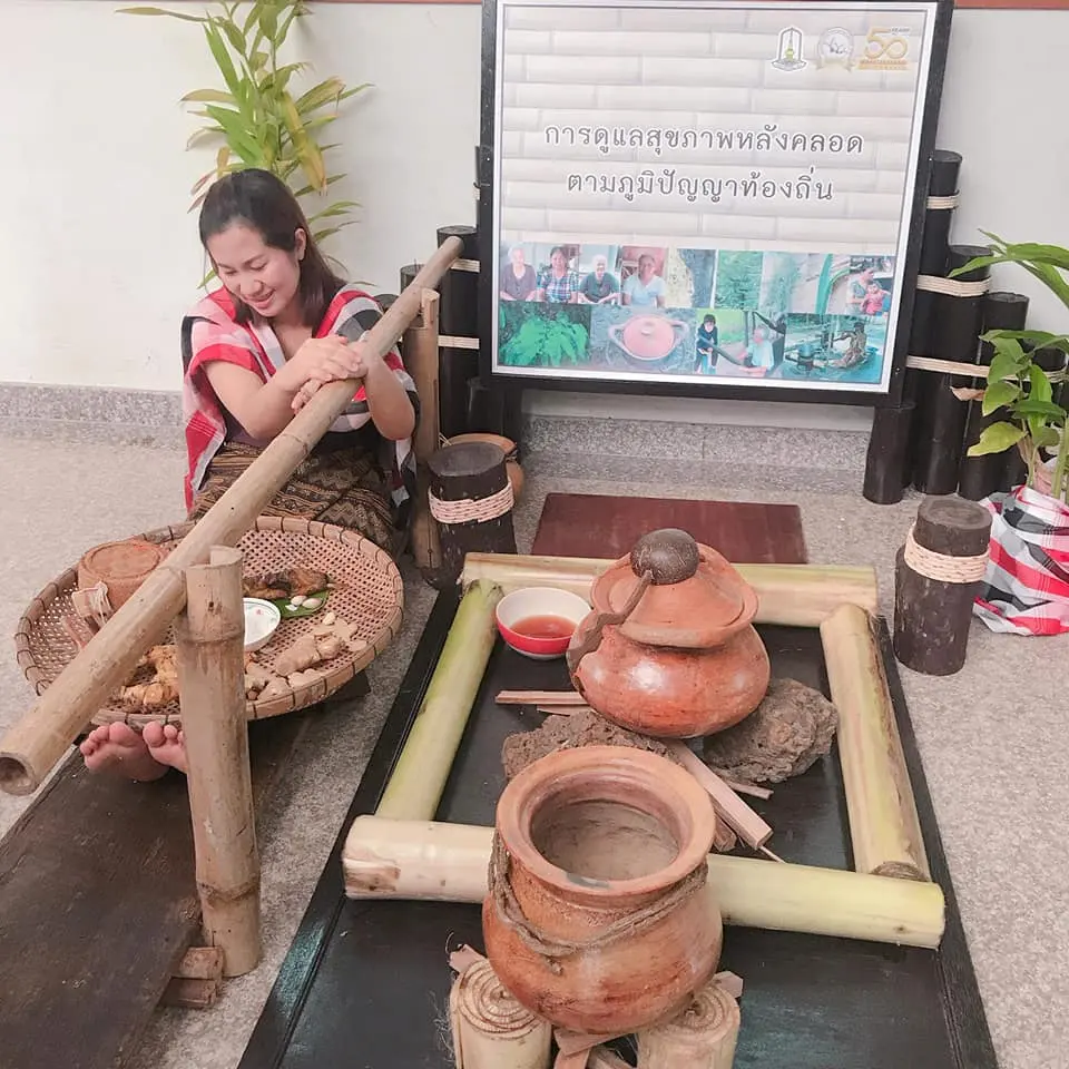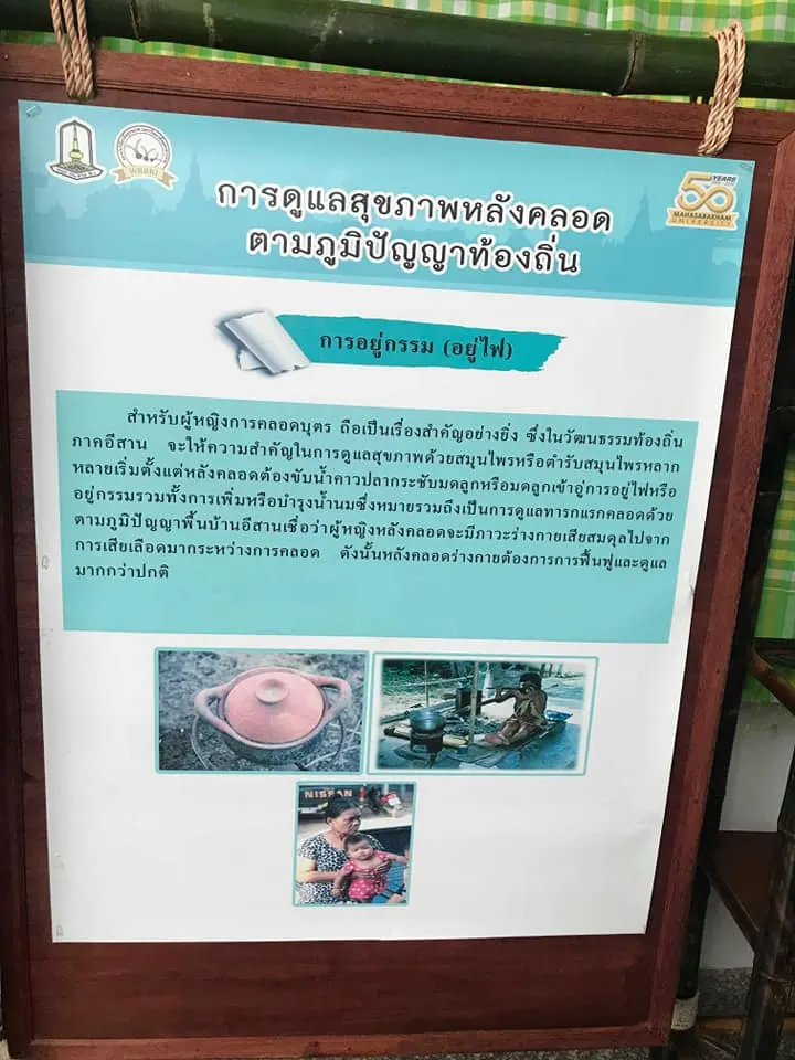 ในส่วนของตรงนี้จะเป็นความรู้ในเรื่องของการดูแลคุณแม่หลังคลอด ตามภูมิปัญญาของท้องถิ่นที่เรานั้นเรียกว่าการอยู่กรรม ในแต่ก่อนนั้นจะอยู่กรรมประมาณ 14 วันหรือว่าสองอาทิตย์ ในการอยู่นั้นจะต้องนั่งในบริเวณที่มีความร้อน และนั่งซดน้ำร้อน ร้อนมากร้อนแบบลวกปากได้ยิ่งดี