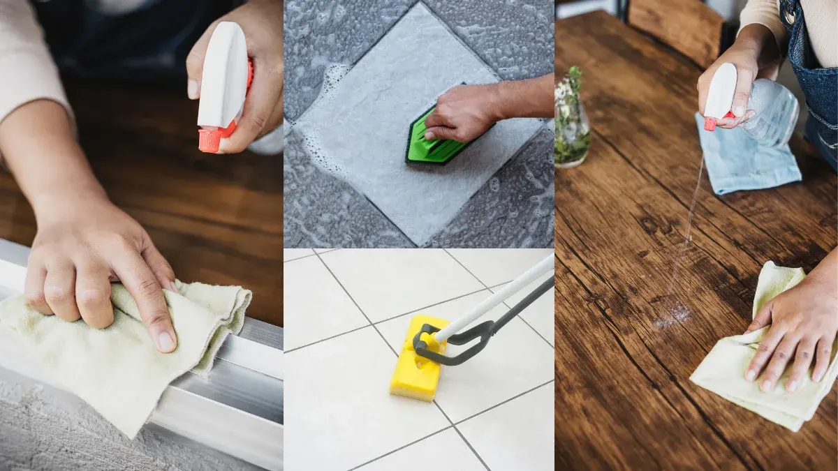 - น้ำส้มสายชู ใส่น้ำส้มสายชูในขวดสเปรย์ แล้วฉีดพ่นลงบนคราบโดยตรง ทิ้งไว้ประมาณ 15-20 นาที แล้วทำความสะอาดซ้ำอีกรอบ