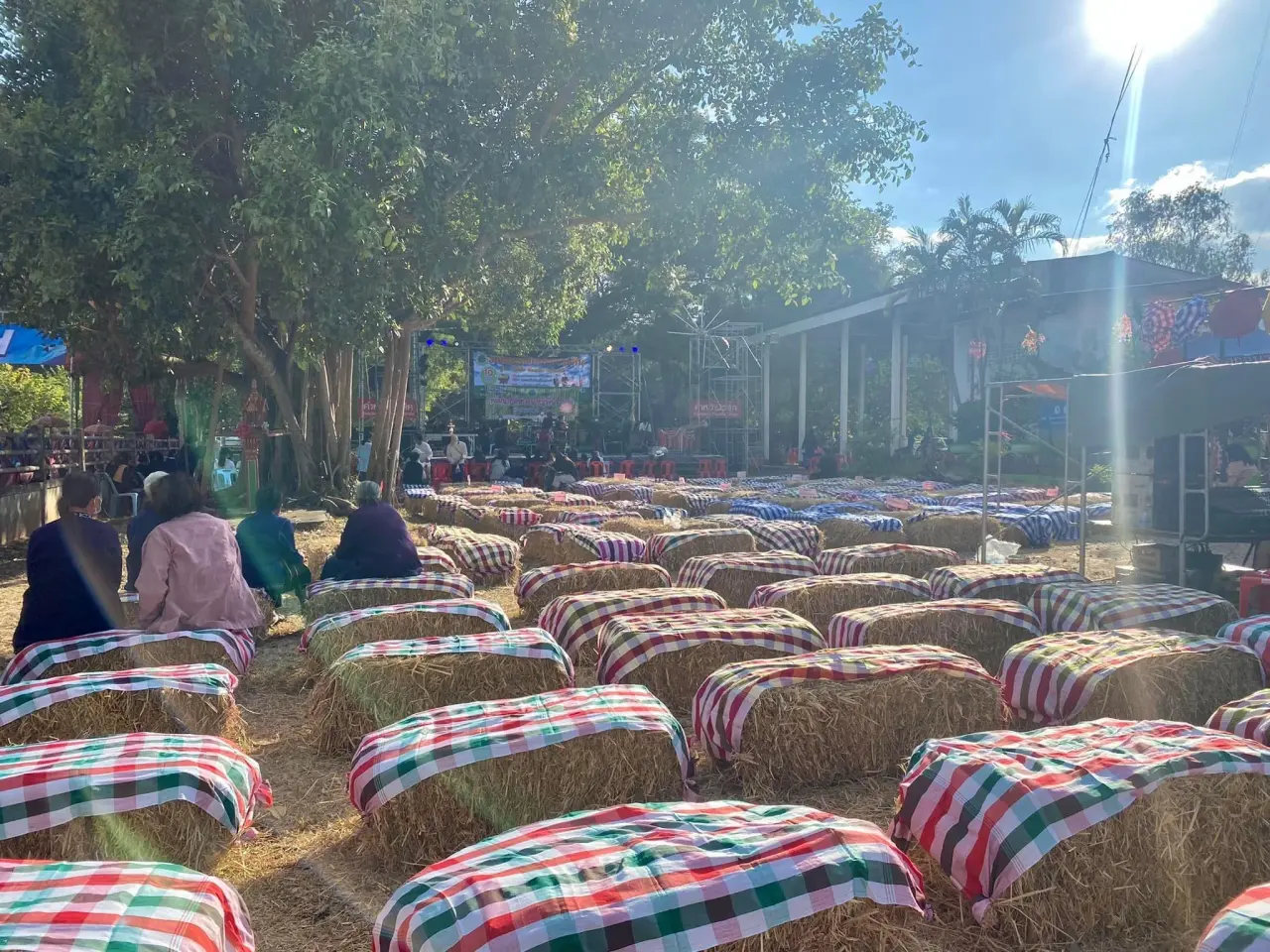 การสร้างรูปแบบที่แตกต่างในการชมมหรสพ ในที่นี้คือเรานั้นได้ชมการแสดงด้วยการนั่งก้อนฟางที่ผันมาจากเก้าอี้เพราะว่าเก้าอี้นั้นมีจำนวนจำกัดและนั่งได้เพียงคนเดียว แต่ในก้อนฟางนั้นเราสามารถที่จะนั่งได้มากกว่า รวมไปถึงหากว่าคันสามารถที่จะนำผ้ามาผูกเพื่อที่จะช่วยลดความคันนั้นลงไป